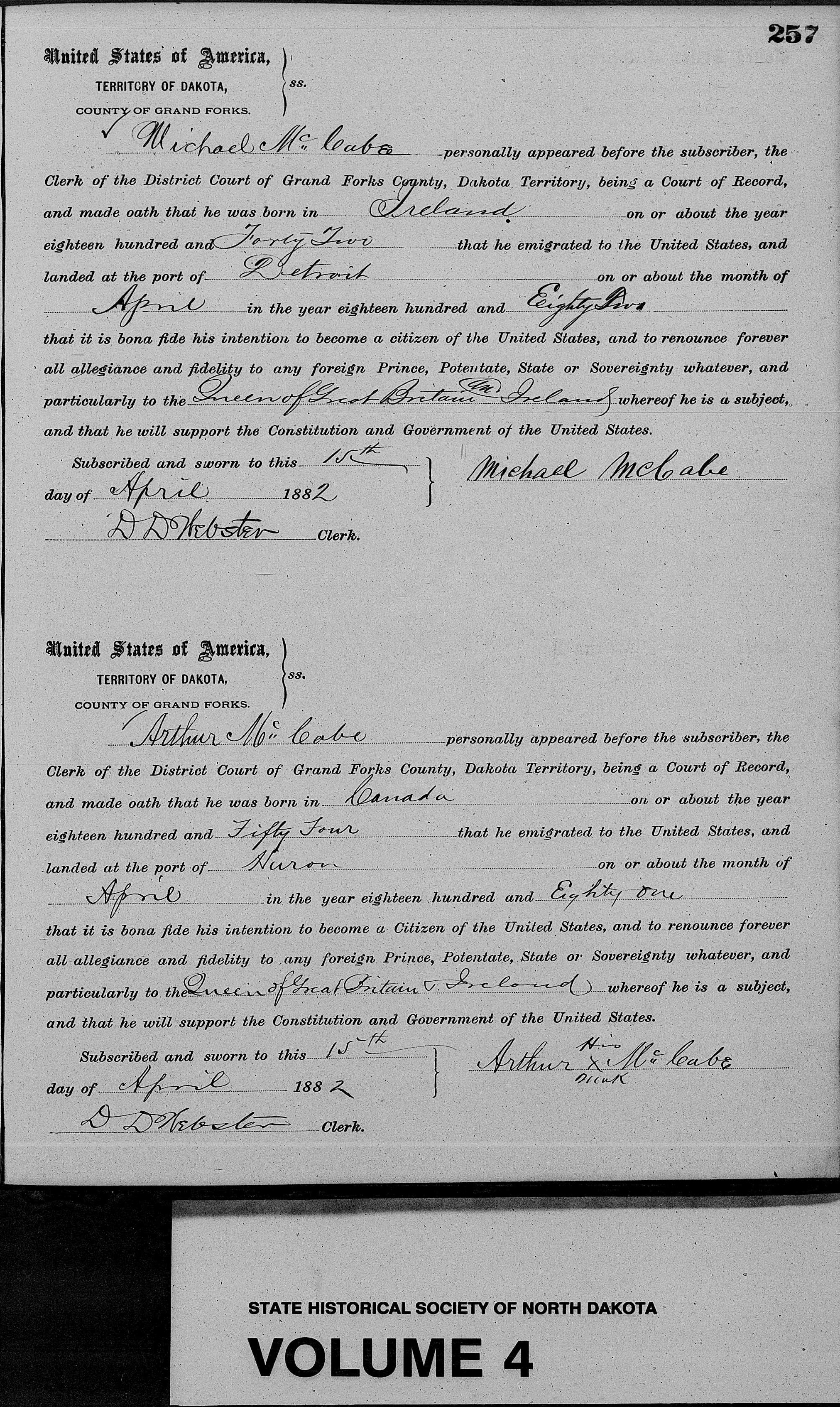 Emigration | April 1882 (Age 40 years) Michael McCabe and His Brother in Law Arthur Applied For Admission Note: Arthur said he came in 1881 and Michael said he came in 1882 but both applied at the same time for US immigration in April of 1882, Grand Forks Co ND.