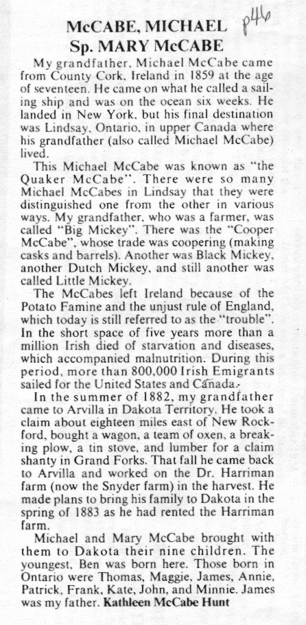 | Shared note | Since Michael's grandfther came from Magheracloone Monaghan it is likely that he too was born in Magheracloone (near Carrickmacross) Monaghan and parish records confirm that. Michael came by himself from Monaghan through Liverpool to NY. The ship John Bright was on the ocean for 6 weeks, and landed in New York Oct 10, 1859. He went on to Lindsay where, according to family lore, his grandfather McCabe, was already settled. He lived with his grandfather Francis McCabe in Ops (Census 1861) and later moved with his parents to Laxton North of Lindsay when they arrived from Monaghan in 1861. He was living in Laxton wehn he married Mary McCABE in 1864, in the Catholic church in Lindsay. The 1871 Census of Ontario lists Michael, (age 30, b Ontario(sic), Roman Catholic, Irish, Farmer, Subdist Ops) with his wife and children living close to her parents. In the Summer of 1882, Michael and his son Tom came to Arvilla, Dakota Territory. He then took a claim about 18 miles east of New Rockford. In Grand Forks he also had bought a wagon, a team of oxen, a breaking plow, a tin stove, and lumber for a \"claim shanty\" . That fall he came back to Arvilla and worked on Dr. Harriman's farm for the harvest. Leaving his oldest son Tom behind with Mary's brother Pat in Minnesota, he returned to Lindsay and returned with his family to Dakota in the Spring of 1883, as he had rented the Harriman farm. Afterwards he applied for a homestead in Hegton Township near Arvilla. Michael and his wife, Mary, brought 9 children with them from Lindsay Canada to Hegton Township close to Arvilla ND in 1883. Their youngest, Ben, was born in Arvilla. All the others were born in Ontario. ND Naturalization records list a Michael McCabe, from Ireland, declaring on 4/15/1882 in GFC (vol D4 p257) and receiving citizenship 6/16/1890 (vol F23, pg215). Headstone in Bellevue Cemetery says : \"Papa\" . Is buried with Tom(son), Mary(wife), Annie(daughter), Gerald(?) and 3 year old Harry (d:1917) Harry was Michael's grandson - son of Ben McCaBE. A few years before he died Michael moved off the farm and lived in Arvilla with is daughter Annie. His sons - Francis, Patrick, and Ben took over farming his land in Hegton. According to the THE PIONEER of Larimore, in an article written on June 5, 1913, \" The funeral of Michael McCabe took place here Monday morning from the Catholic church and was largely attended. Mr. McCabe died at Arvilla last Thursday afternoon at 3 o'clock. The remains were interred in Bellevue Cemetery.\" |