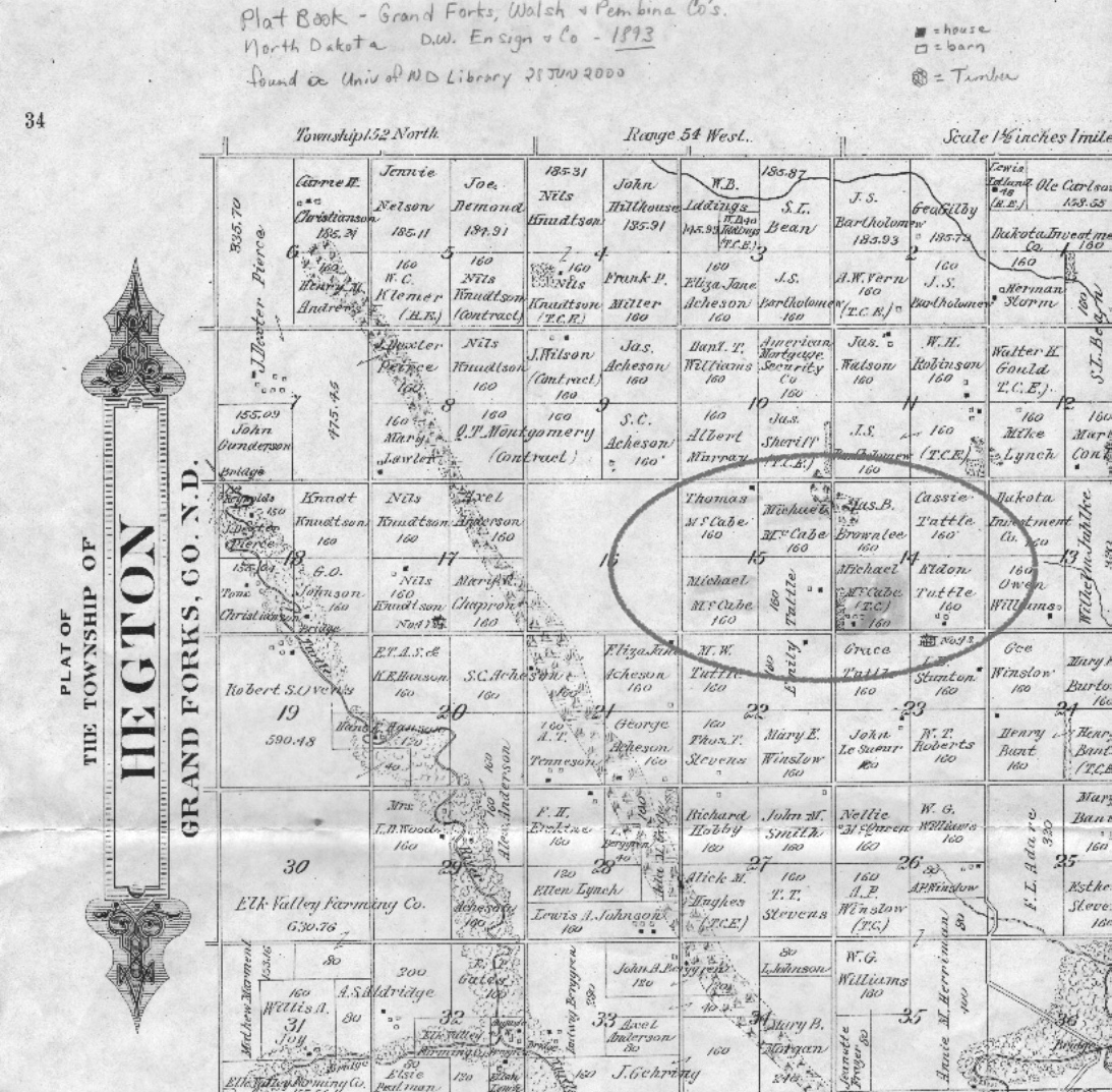 | Residence | The 1915 census of North Dakota shows that Pat and Ben's familes still lived in Hegton township, as did their sister Annie MCCABE Krause. Frank and Jim's families lived in Larimore at that time. Uncle John was living in Arvilla, just south of Hegton Township. Aunt Kate MCCABE Crowley and her husband Thomas were living in Ray ND, west of Minot ND. |