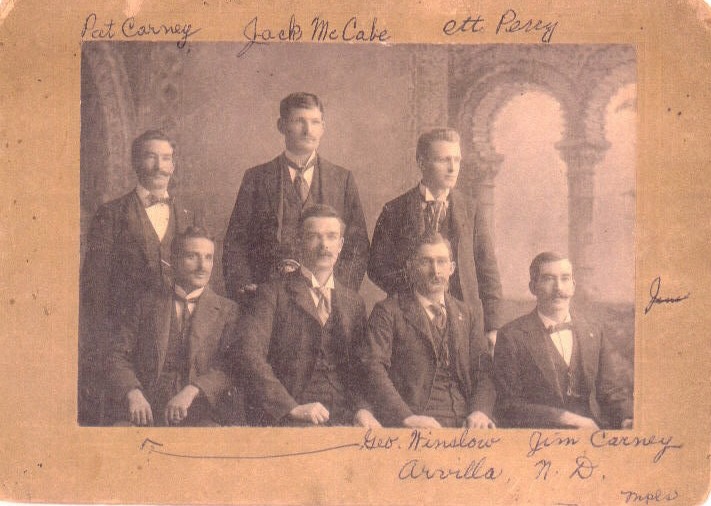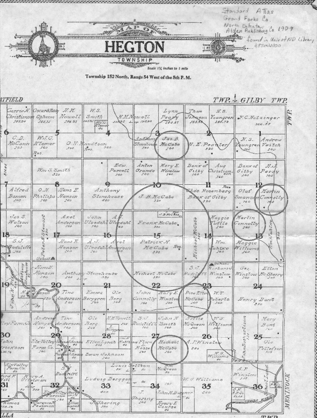 | Residence | The 1915 census of North Dakota shows that Pat and Ben's familes still lived in Hegton township, as did their sister Annie MCCABE Krause. Frank and Jim's families lived in Larimore at that time. Uncle John was living in Arvilla, just south of Hegton Township. Aunt Kate MCCABE Crowley and her husband Thomas were living in Ray ND, west of Minot ND. |