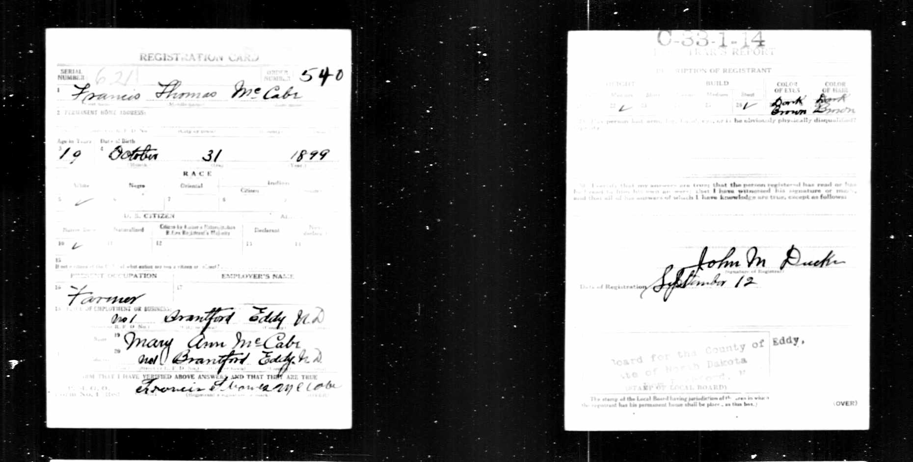 | Military | Francis T McCabe draft registration showed his mother's name, his birth date, and residence. |