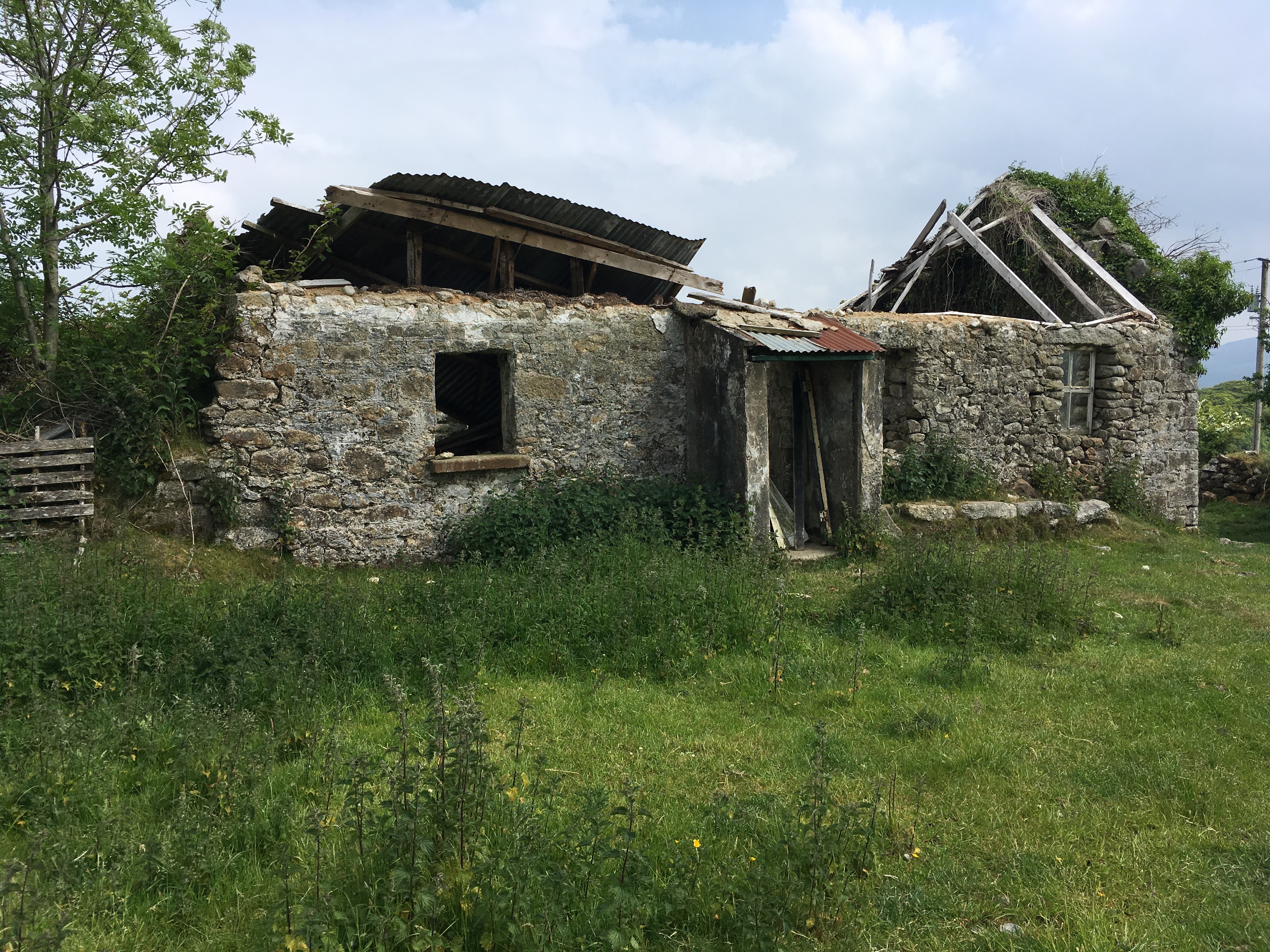 | Fact | in 1989 on my first trip to Ireland I encountered a Mr Conway in a church graveyard near Tinahely. I asked if he knew where Knocknaboley was. He informed me that he knew where it was; that in fact he had been born in one of the three Griffin houses on Knocknaboley and he gave me directions to to the townland which I visited. In 2017, from land records in Dublin, I determined that my Griffin family had sold their old Griffin farm to the Conway family - so that the farmhouse Mr Conway was born in was the same as the birth home of my ancestors! Visiting Wicklow once again I found the ruins of the Griffin home again in 2017 and took these photos of the ruins and the land. (It is referred to as the Conway place by the locals.) |