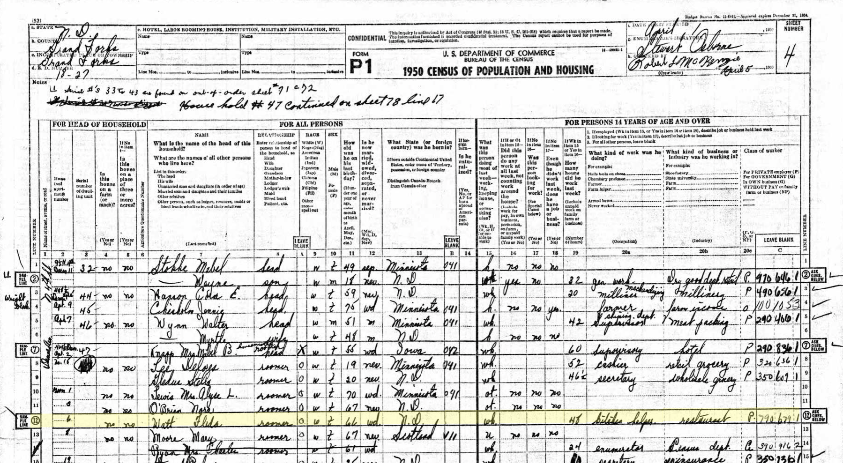 Census | 1950 (Age 65 years) Note: Widowed, she lived in a rooming house and worked as a kitchen helper.