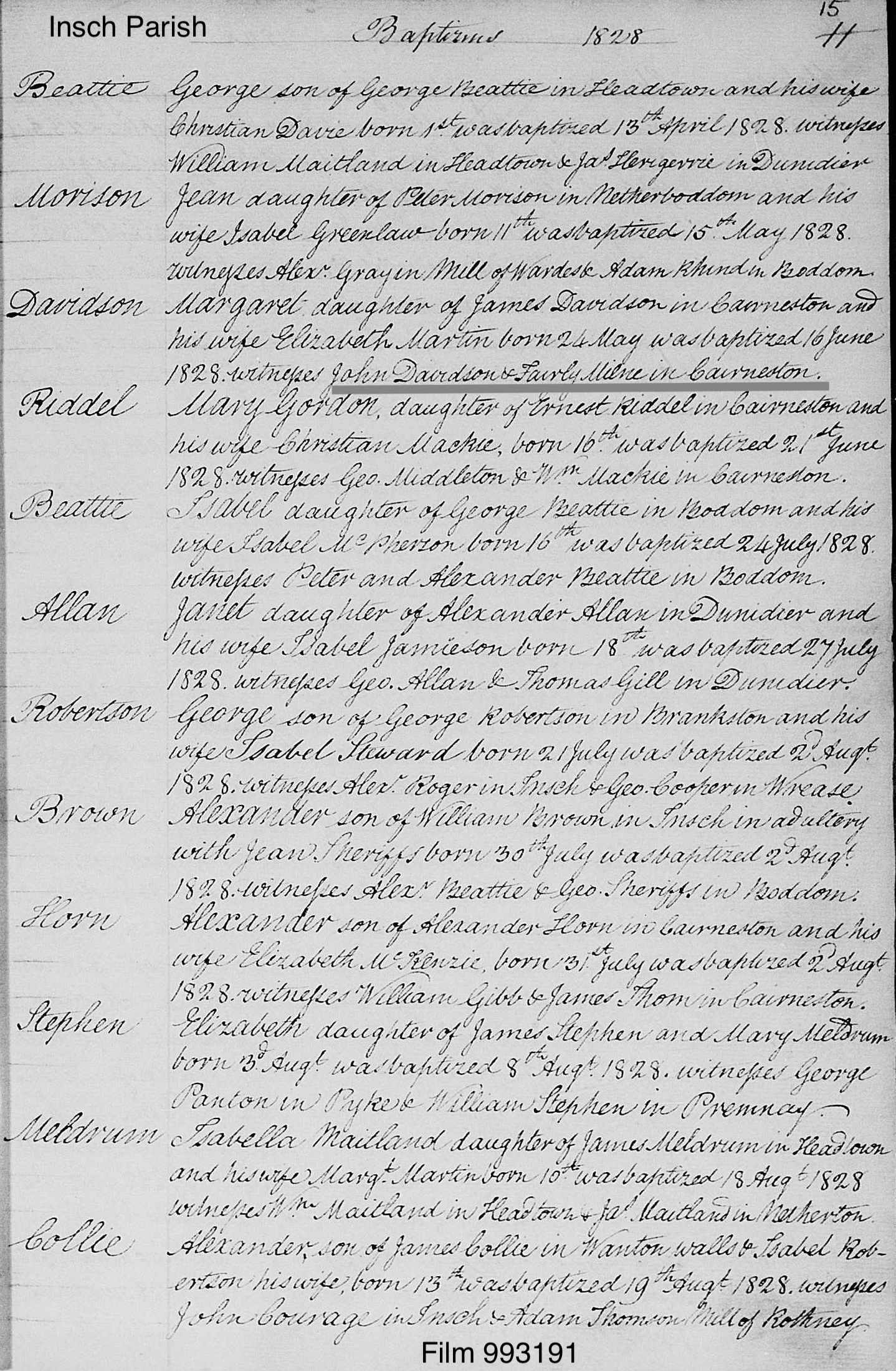 Fairley Milne of Cairneston, Insch Parish, Was Witness to a Baptism Note: This document is the oldest known document that directly mentions Fairley Milne. According to the history of Fairley written in 1912, he was born in 1812; thus he is almost 16 years old at the time of this 1828 baptism record.