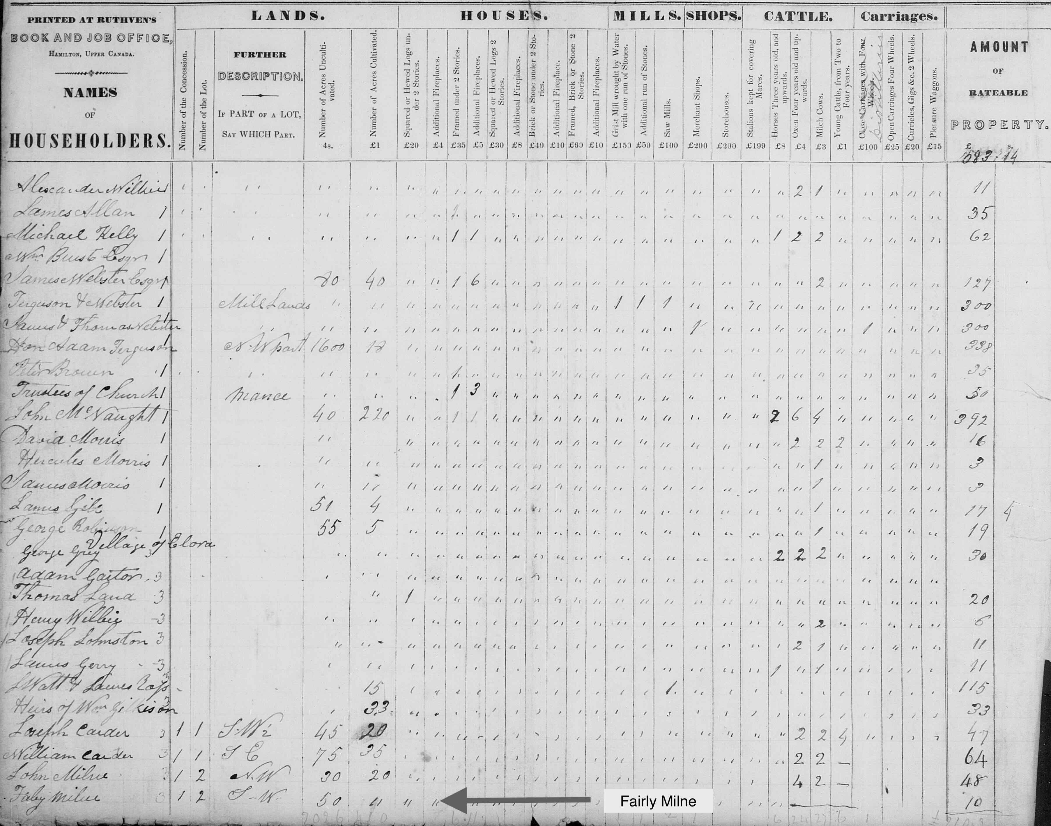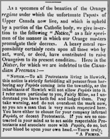 | Event | Fairley Milne was a Protestant from Scotland. The recent immigrants from Great Britain brought the Protestant vs Catholic fight to Ontario when they immigrated. As the lands of Ontario called the Queen's Bush opened opened up in the midcentury, evidently there was a movement to keep the area free of Catholic immigrants. Evidently Fairley was not prepared to go along with this and shared his home and food with Catholic neighbors. A public cowardly reprimand against him was circulated but Fairley received support from the Catholic press. A Catholic paper in 1858 printed the public statement from a Protestant "Friend". |