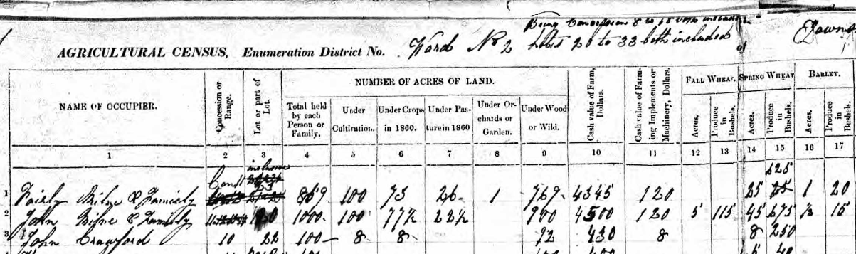 | Property | Various records in the Townland Papers of Howick reflect properties Fairley received from the Crown. It also shows Fairley could write his name. Included are partial records that show Fairley applied for a patent on Lot 21 Conc 11 and 12 (200 acres). He also applied for other lands not shown here. |