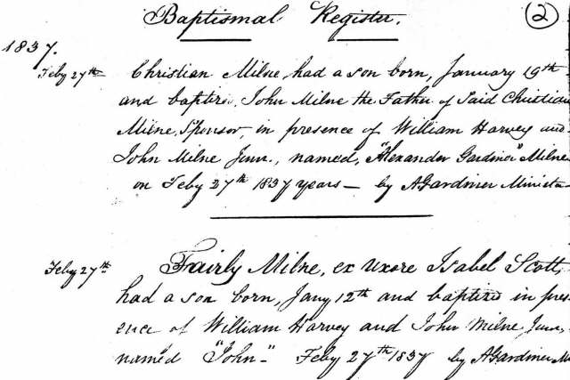 Birth of a son#1 | John Scott MILNE January 12, 1837 (Age 24 years) Note: Baptism record found on Internet - no record of its provenance however.