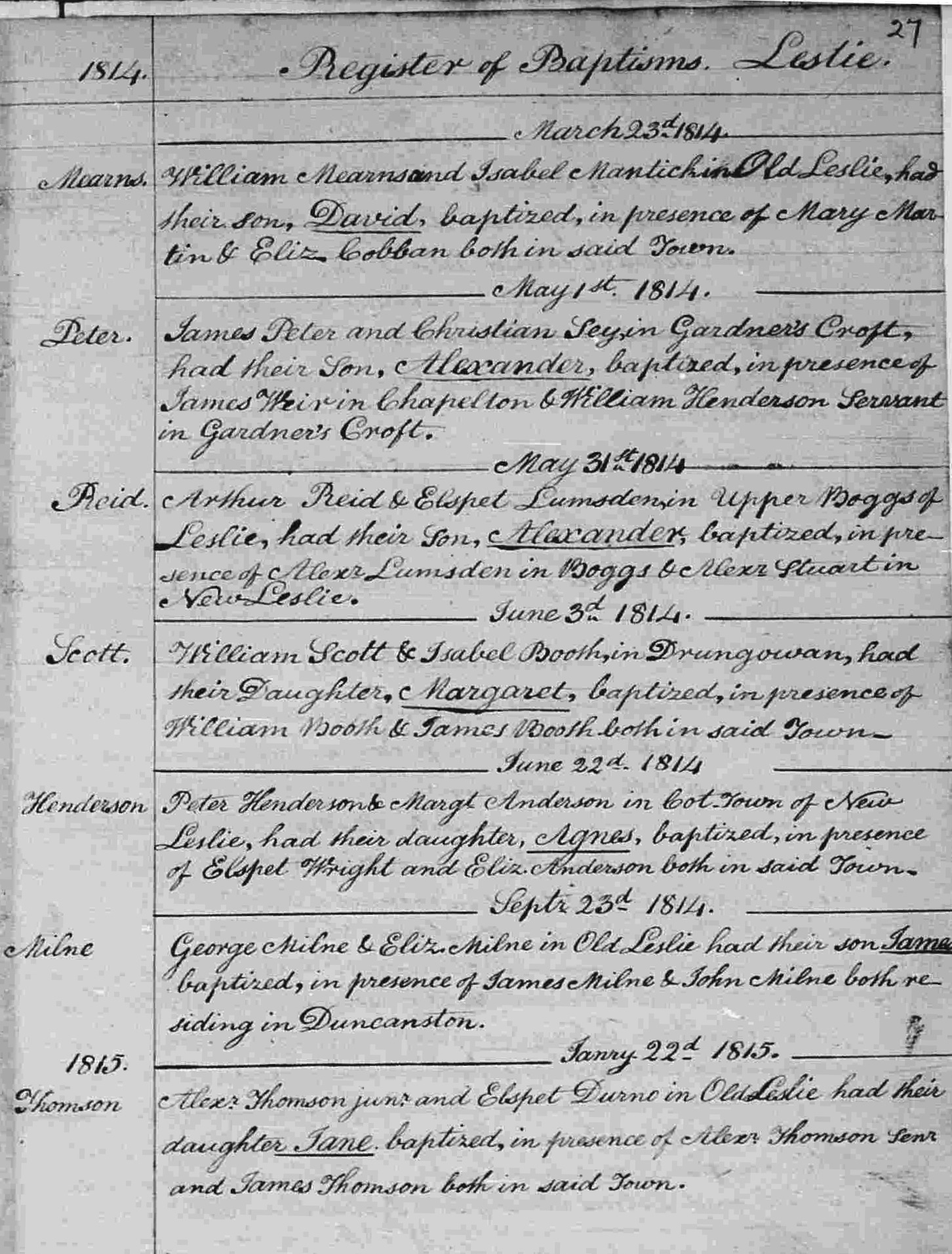 Birth of a sister | Margaret SCOTT June 3, 1814 (Age 19 months) Note: Record states she was baptized in Drumgowan, Leslie Parish, Aberdeenshire, the former home of her mother.