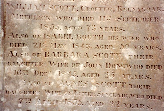 | Burial | Inscription on tombstone: "In memory of William Scott. crofter,.Belnagoak Methlick who died 11th September 1855. aged 73 years. Also of Isabel Booth his wife. who died 21st May 1843. aged 50 years. Also of Barbara Scott their daughter, wife of John Dow who died 16th Decr 1845 aged 25 years. Also of Agnes Scott their daughter wife of Peter Sinclair. who died 7th April 1855 aged 22 years. Barbara Scott wife of James Scott died 19h May 1897 aged 73. The said James Scott, farmer, Belnagoak died 9th July 1900 aged 75 years." |