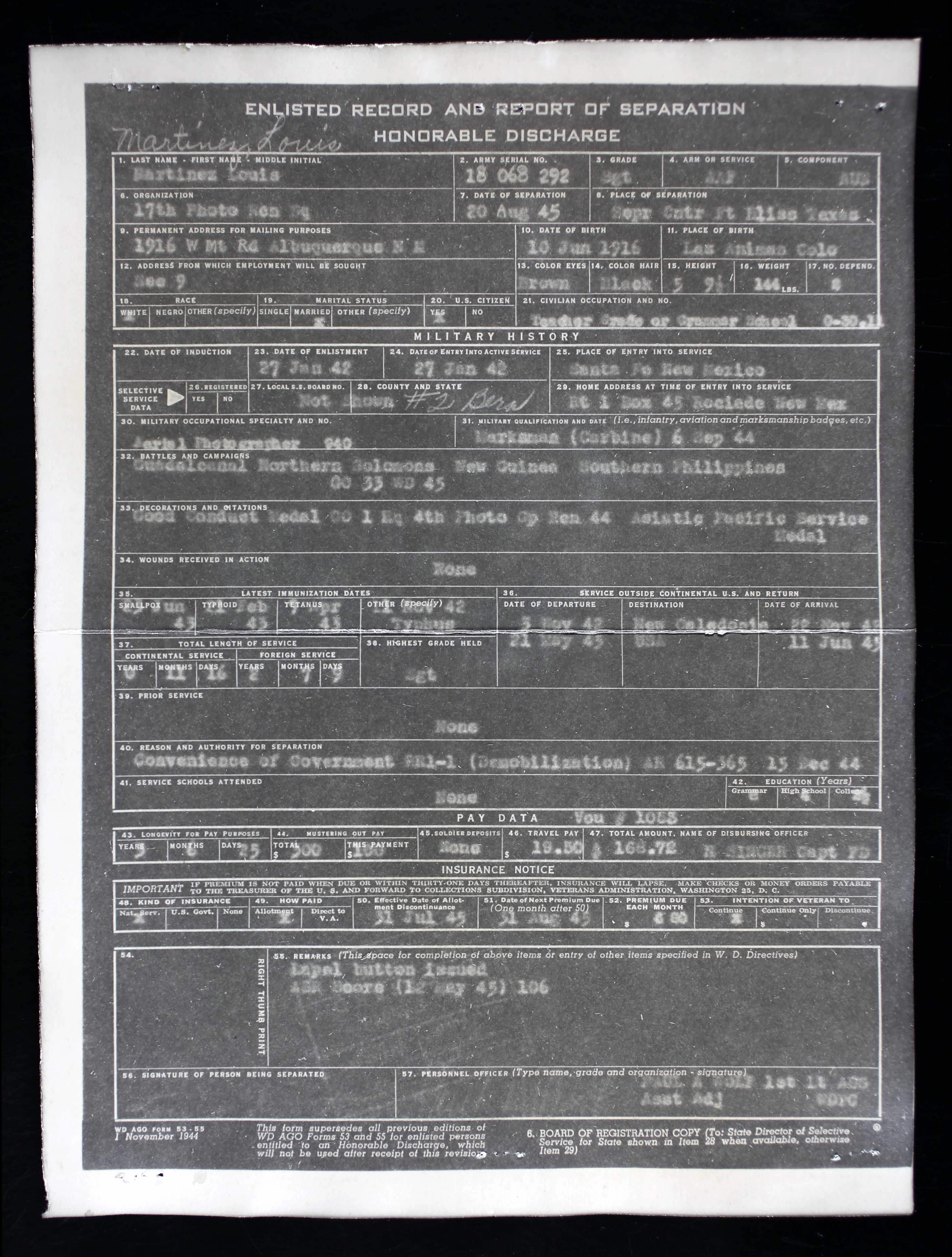 | Media object | Format: image/jpeg Image dimensions: 3,744 × 4,944 pixels File size: 1,264 KB Type: Document Highlighted image: no Note: Louis Martinez, Mary Lou McCabe's father, was a veteran of WW2. He served in the South Pacific for 2 and a half years in the army air corp.
