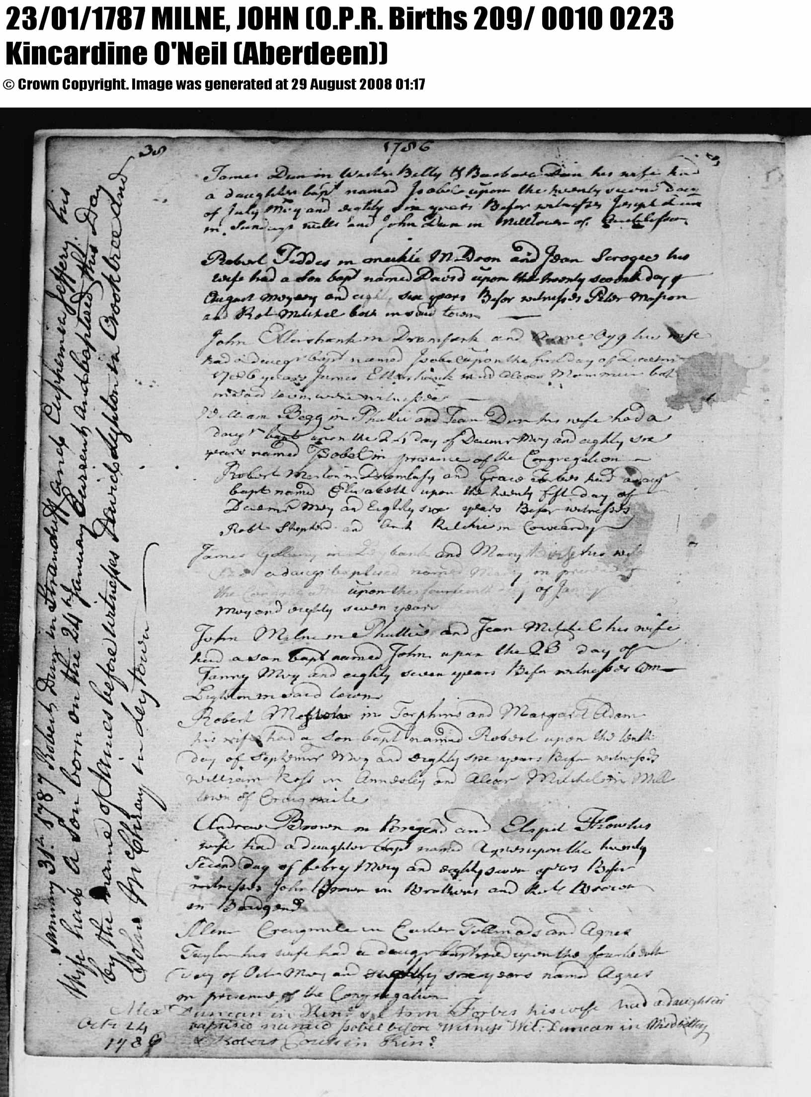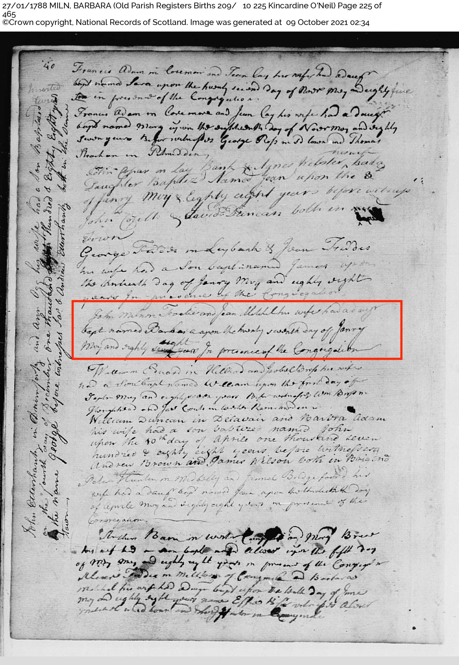 Barbara MILNE Baptism: January 27, 1788 — Kincardine O'Neil, Aberdeenshire |