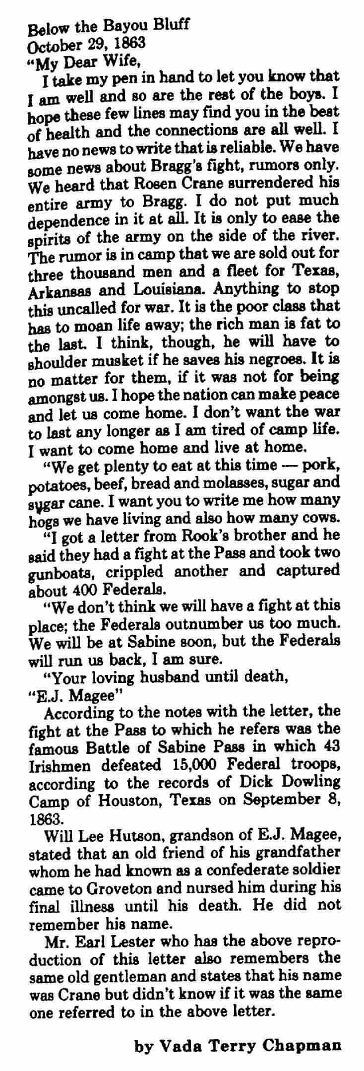 | Note | Evan James Magee was a reluctant soldier in Co A, Gould's Battalion,Walker's Division of Randle's Brigade in the Confederate army. His unit was referred to as Walkers Greyhounds because of their ability to cover distances quickly. His unit fought in Louisian and Arkansas. He wrote a letter during the war to his beloved wife Malinda criticizing the Confederacy for the war. (See the media section) His unit was disbanded at Navasota Tx in 1865 at the end of the war. It was thought that many confederate soldiers in Texas would not follow Lee's order to surrender but would follow other confederate generals west of the Mississippi to continue the War of Insurrection. However, Evan's unit and others at Navasota had had enough of war and they "voted" to go home with their feet. |