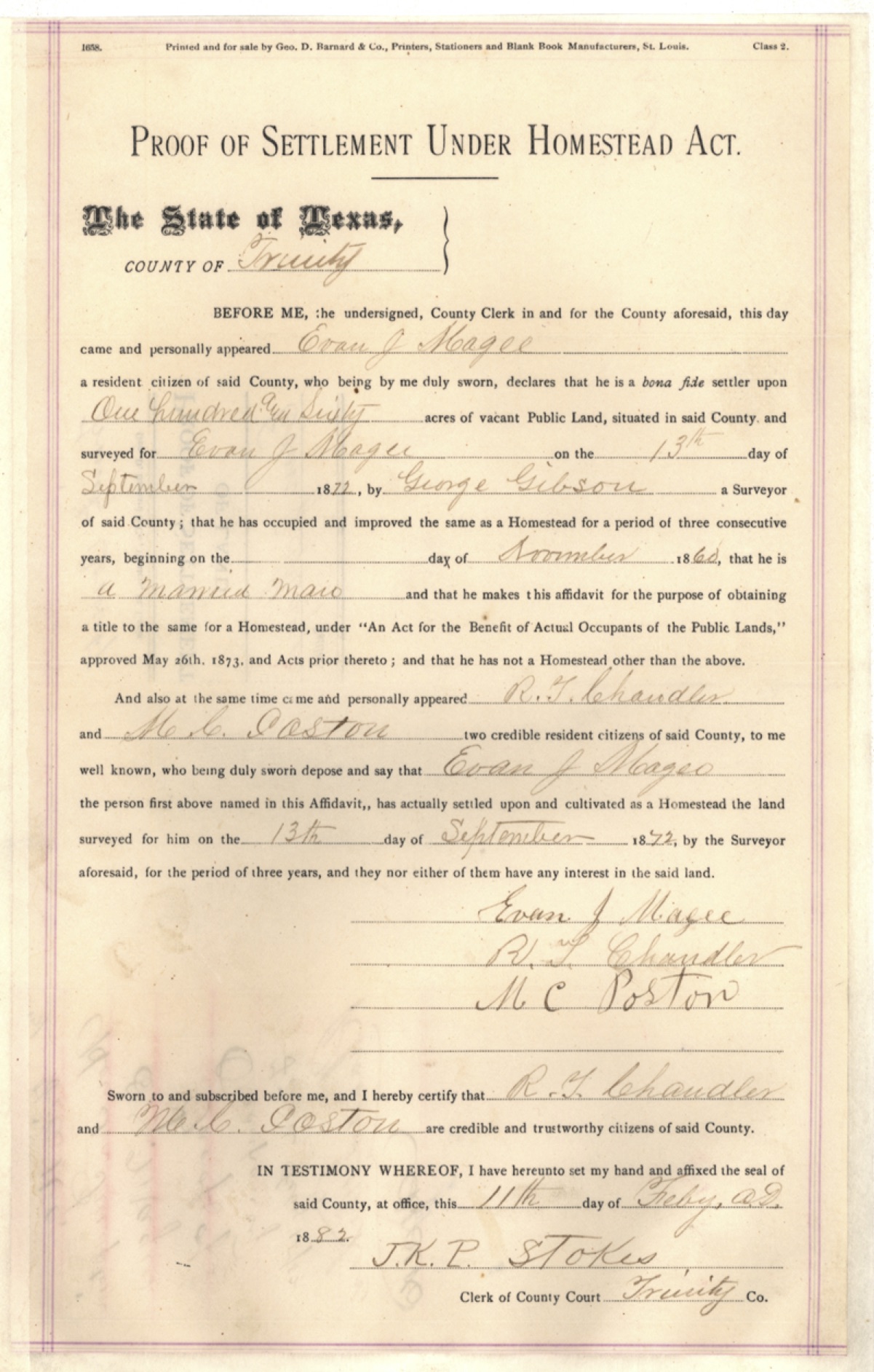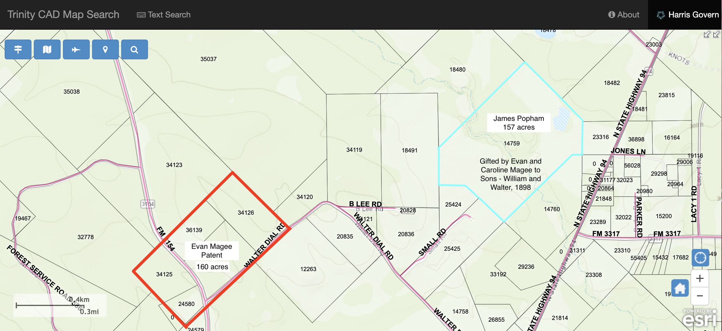 | Property | Evan James received title to from Texas in 1889. He had to be resident on the land for 3 years to get title. It is clear from the documents that he was on the land by 1873. This must have been his home place from 1872 until at least 1898. County: Trinity Abstract Number: 458 District/Class: Houston Preemption File Number: 000169 Original Grantee: Magee, E J Patentee: Magee, E J Title Date: Patent Date: 23 Aug 1889 Patent No: 233 Patent Vol: 22 |