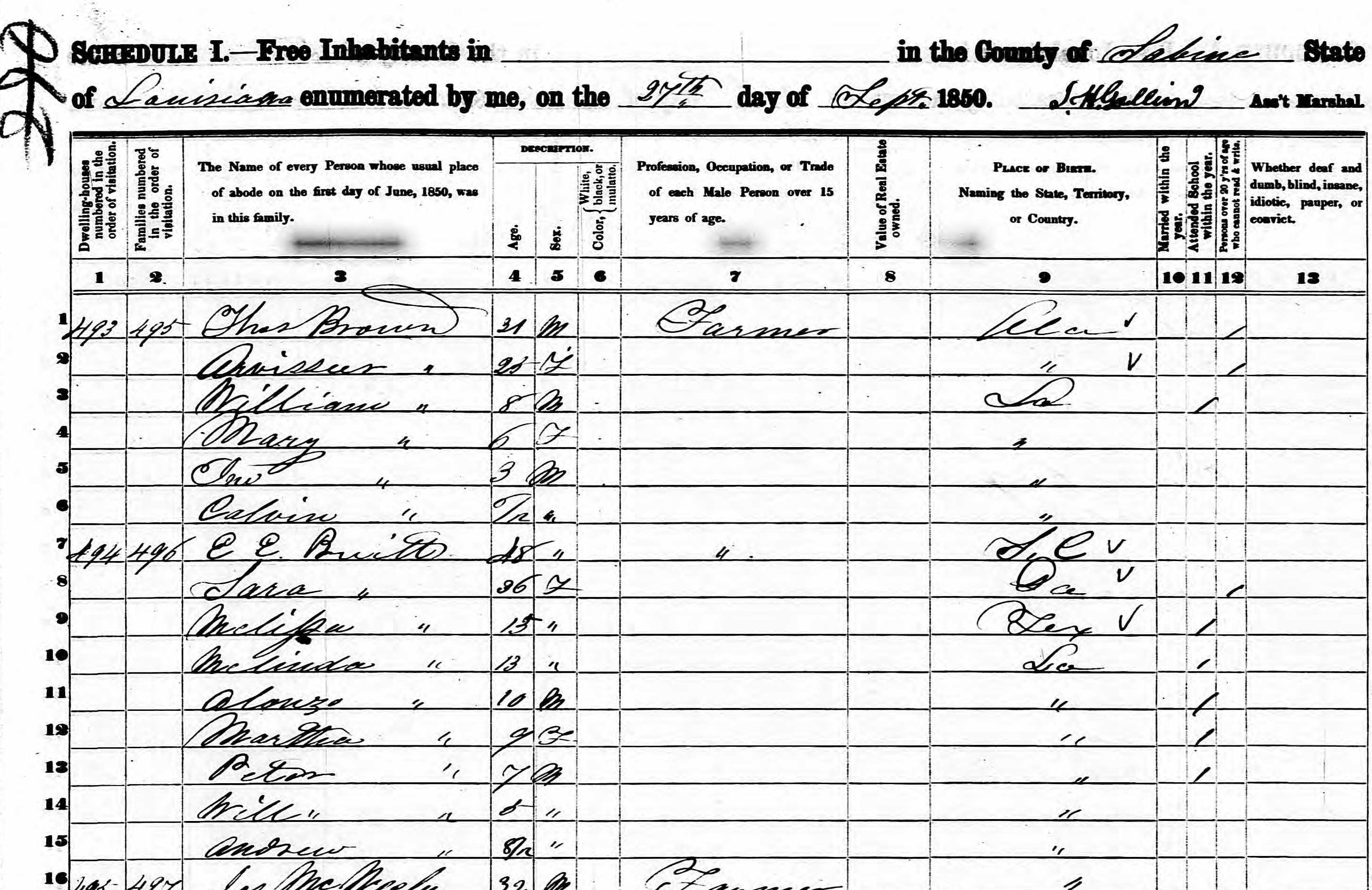 | Census | Notice Elijah is called E E Pruitt , not E D Pruitt, which suggests that Edwards is his middle name. E E Pruitt 48 Sara Pruitt 36 Age 36 Born GA Melissa Pruitt 15 Melinda Pruitt 13 Alonzo Pruitt 10 Martha Pruitt 9 Peter Pruitt 7 Will Pruitt 5 Andrew Pruitt 0 |
