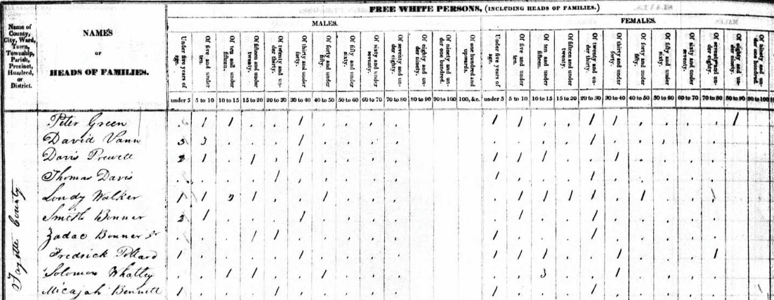 | Census | In 1830 census Micajah showed up in Fayette Co Ga. He had with him one small boy and girl - evidently Peter and Frances - and his wife Sarah. |