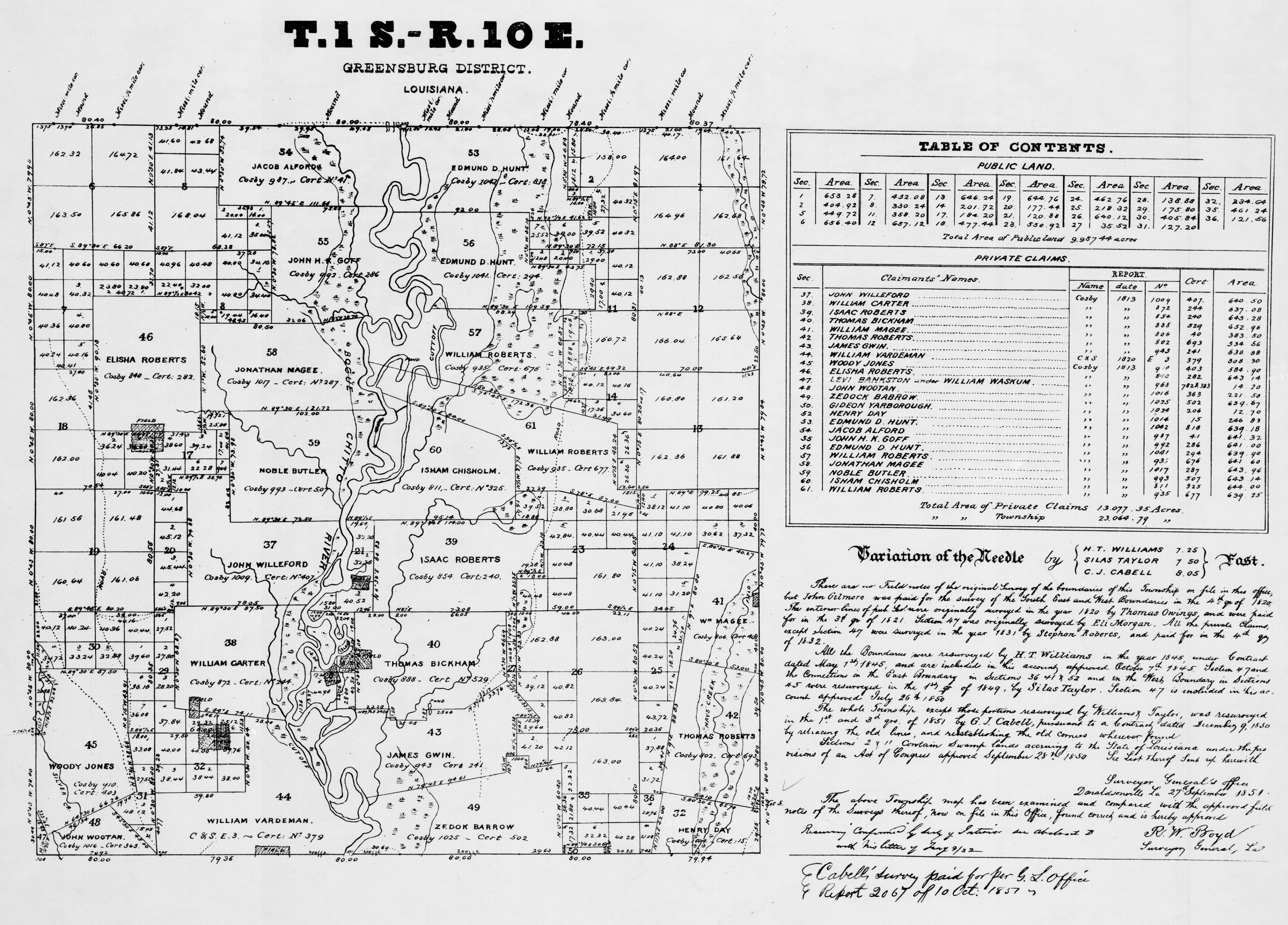 | Property | By 1813 Jonathan Magee was residing on his farm in Township 1S, Range 10E in St Tammany Parish. In 1813 Spanish Florida was incorporated into the US and all residents had their 1813 land claims verified by a US Commission in 1819. Jonathan Magee was certified as the rightful owner of T1S,R10E by the commission, as documents from the LA Land Archives verify. |