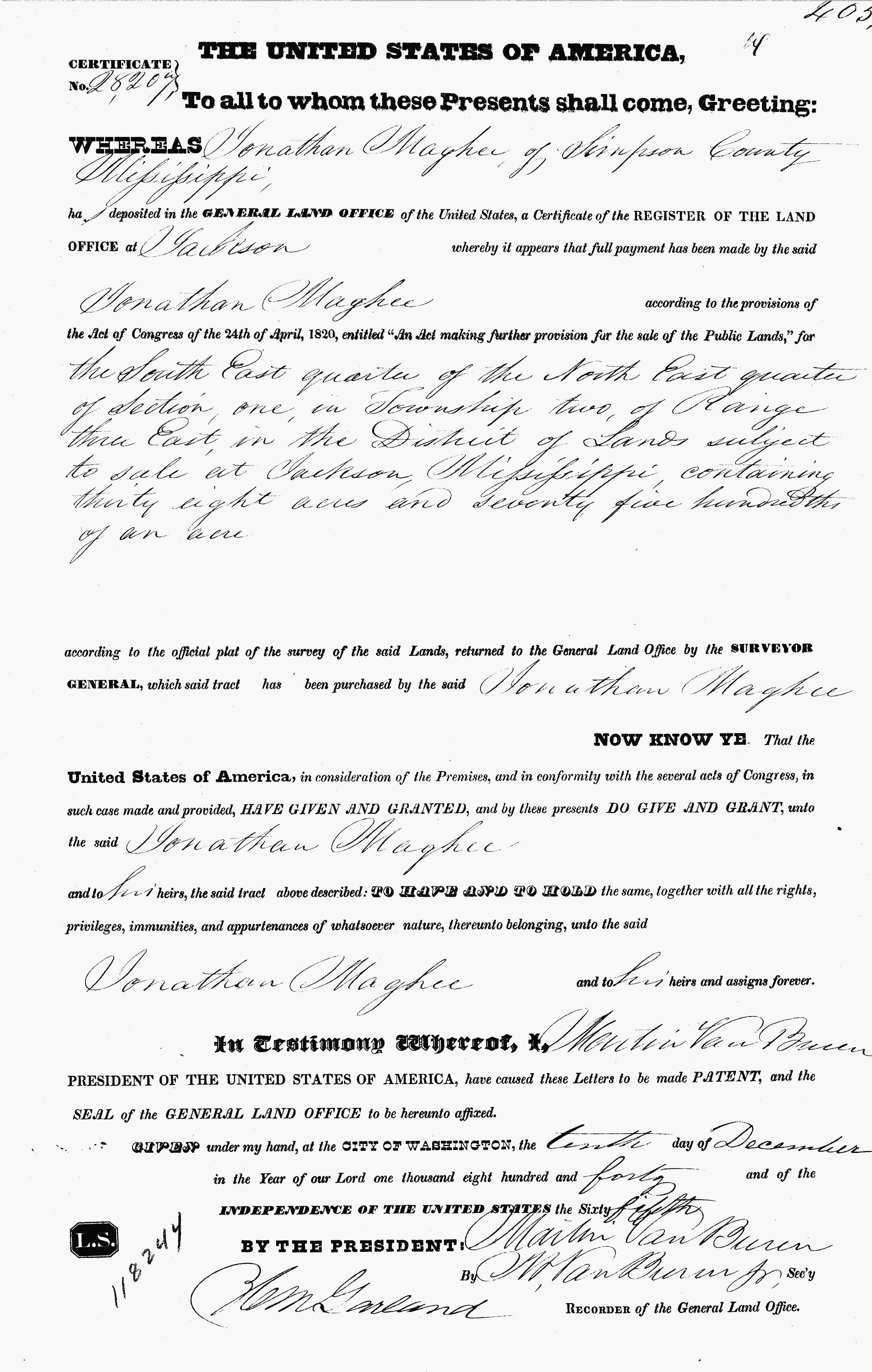 | Property | Name: Jonathan Maghee Issue Date: 10 Dec 1840 Acres: 38.75 Meridian: Choctaw State: Mississippi County: Simpson Township: 2-N Range: 3-E Section: 1 Accession Number: MS2090__.405 |