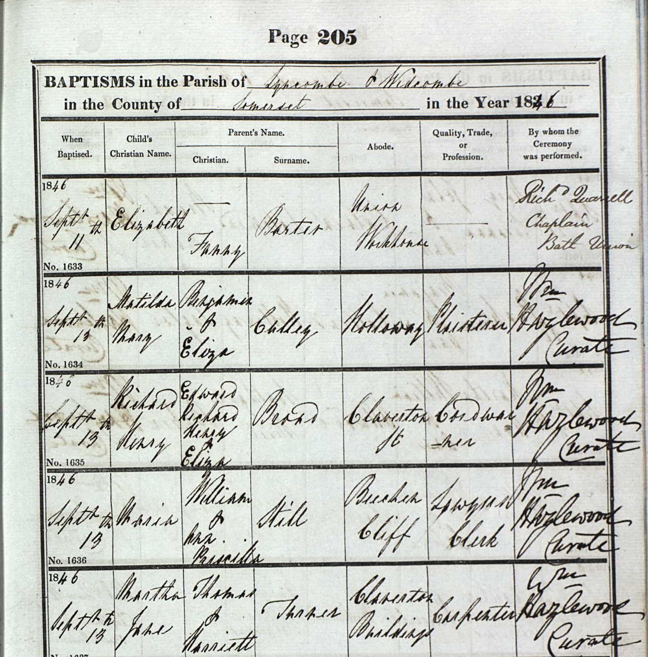 Birth of a sister | Maria STILL August 24, 1846 (Age 5 years) Note: The census of 1851 states that Maria was born in Bath Somerset and the GRO record states that Maria Still was born Aug 24, 1846 in Bath. Her parents are listed and William is stated to be a Law Clerk. Since we have letters from William to Ann Priscilla in Bath, it is certain that this birth entry corresponds to our family. The family was listed as living in Ivy Cottage, Widcombe, Somerset, but the baptism certificate states that their abode was in Beechen Hill. Ivy Cottage and Beechen Hill are just across the little river from the main part of Bath.