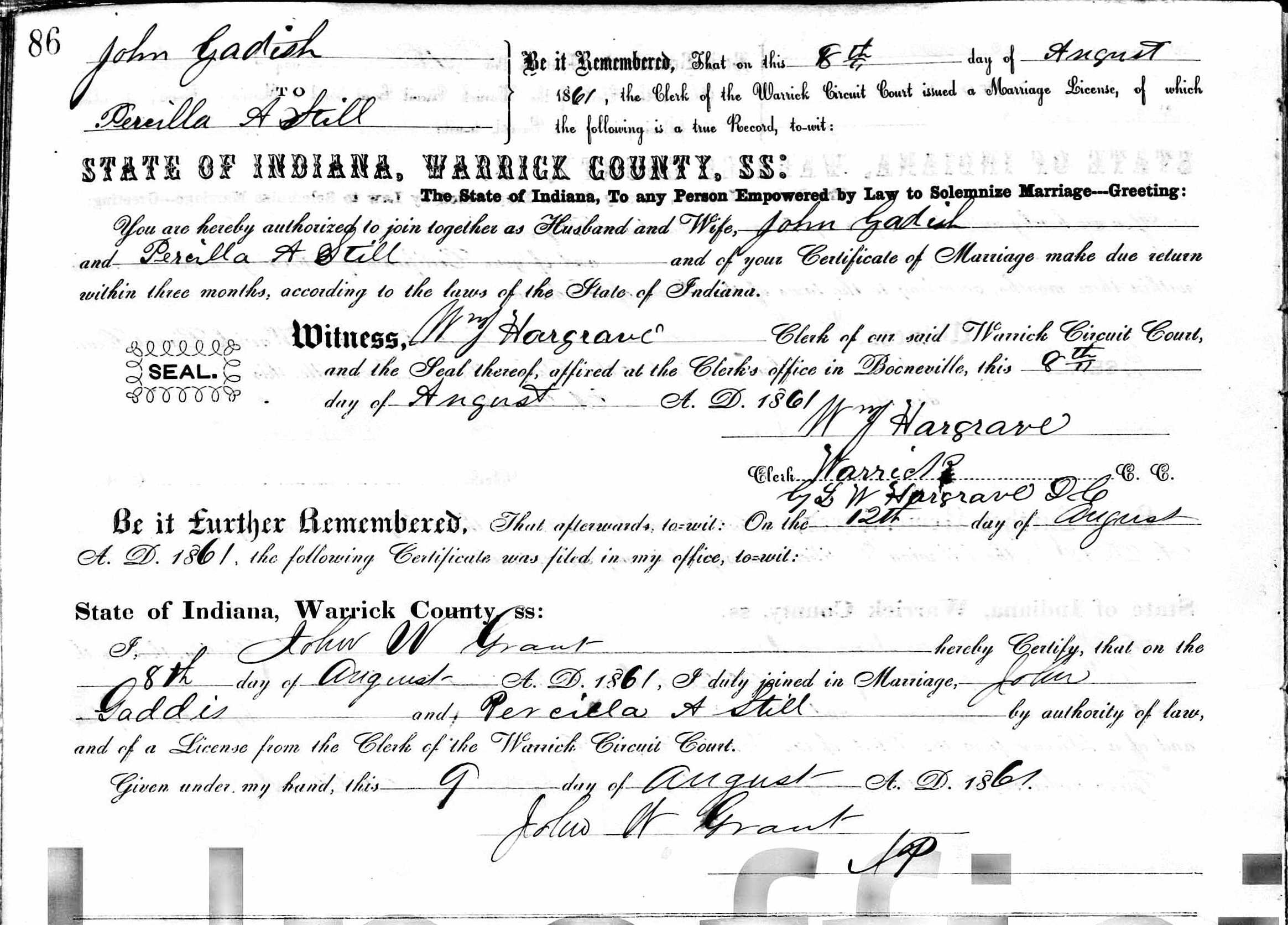 Marriage: August 8, 1861 — Millersburg, Warwick Co., Indiana |