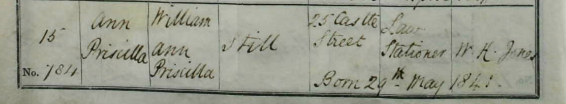Birth of a sister | Mary Ann STILL May 1845 (Age 3 years) Note: From the birth records at St Andrews, Holborn. Mary Ann - born to William and Ann Priscilla Still of Castle Street. William is a Law Stationer. Baptized 4 May 1845 by J.D. Hare, LDD. No. 2534.