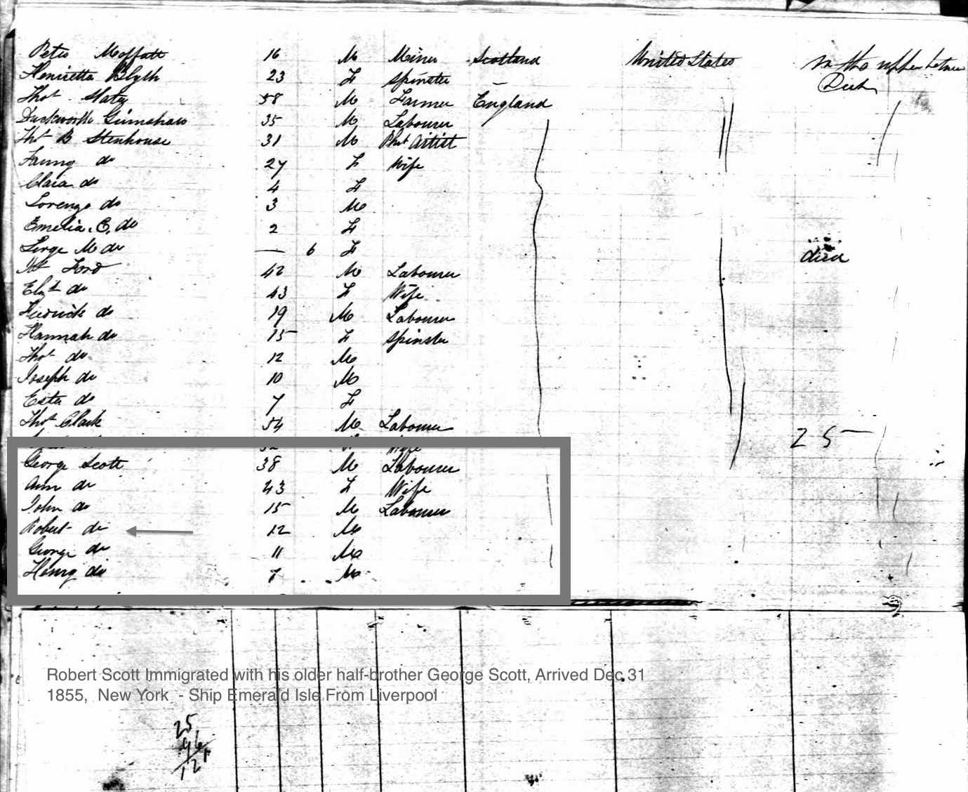 | Immigration | By 1855 Robert's father Thomas had died and his older siblings were drifting to the United States. His oldest half sister Sarah Cook had moved to Ohio and was moving on to Council Bluffs IA. In Graveley Robert was probably living with his older half brother George Scott who decided to immigrate to the US in Dec 1855, taking Robert with him. The passenger list for the ship Emerald Isles which arrived Dec 31, 1855 from Liverpool, showed Robert Scott, age 12, arriving with George's family. In addition the 1851 census records from Graveley, which show Robert living with his father, had no son named Robert in George's family. Subsequent census records in Iowa also show no son Robert in George's family. So Robert Scott, age 12, in the passenger list is very likely George's half brother Robert. A Description of the Ship Emerald Isle Ship: 1736 tons: 215' x 42' x 21' Built: 1853 by Trufant & Drummond at Bath, Maine A famous clipper packet, the full-rigged Emerald Isle carried a total of 1280 Mormons in three voyages across the Atlantic Ocean. The first passage began on 30 November 1855 at Liverpool with 350 Saints on board. Elder Philemon C. Merrill and his counselors, Elders Joseph France and Thomas B. H. Stenhouse, presided over the emigrant company. Captain George B. Cornish, a veteran mariner, commanded the vessel. In 1848 he was listed as master of the 895-ton ship Sheridan. The crossing was marked by some damage caused by high winds and heavy seas, the deaths of two children, and three marriages. After a relatively fast crossing of twenty-nine days the ship arrived on 29 December at New York harbor. |