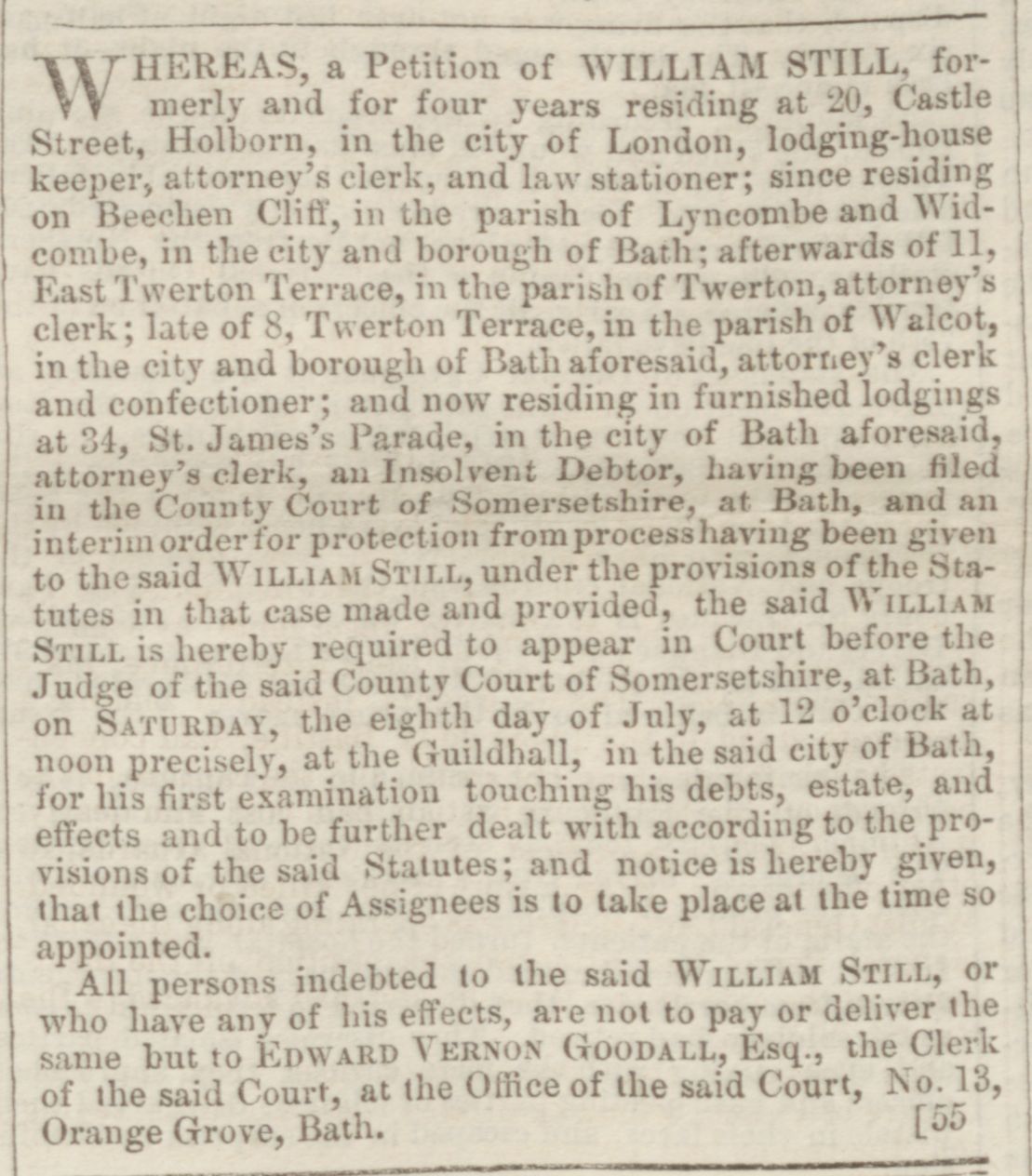 Fact | Bankrupt Note: In 1848 William Still was living in Bath but was summoned to court for examination of his debts at the County Court of Somersetshire in Bath, July 8, 1848.