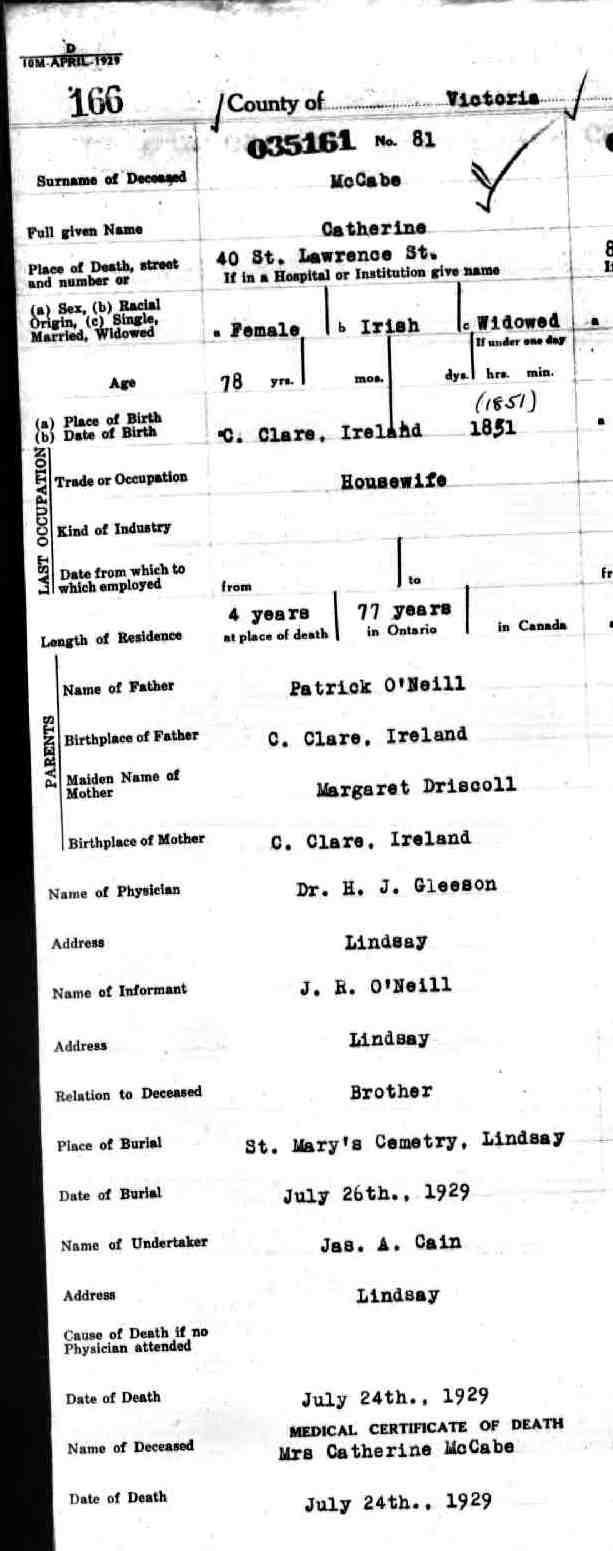 Catherine ONEIL Birth: 1851 — County Clare, Ireland Death: December 13, 1926 — Lindsay Ontario |