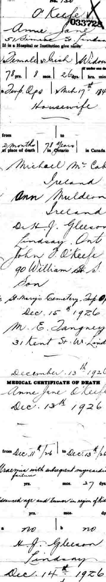 Burial of a maternal grandfather | Michael McCABE January 1, 1889 (Age 13 years) Cemetery: Catholic Cemetery Note: Burial record is recorded in latin in the records of St. Mary's in Lindsay. Remains were moved to St Mary's Cemetery in Lindsay.