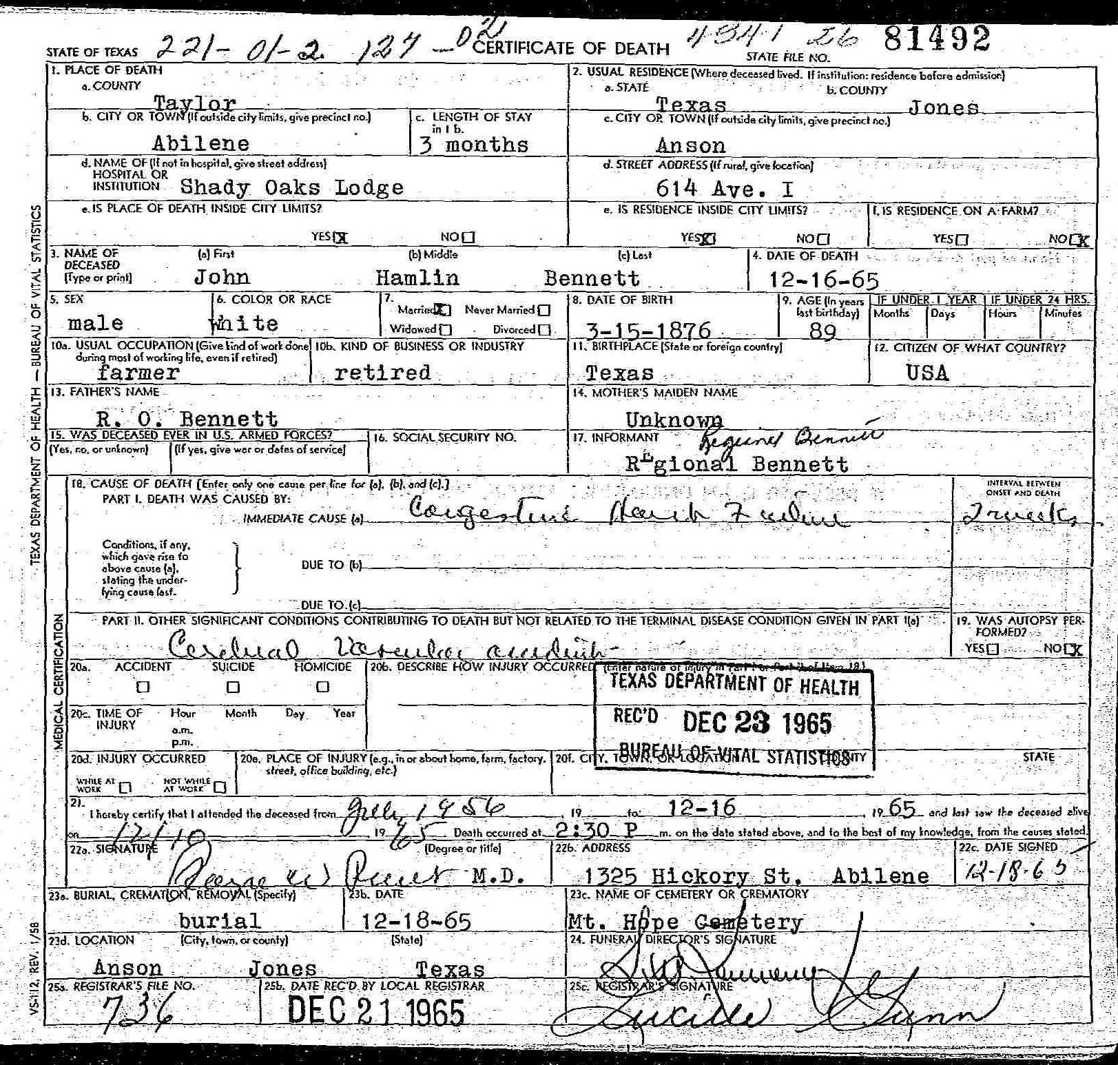 | Death | Obituary of John Hamlin Bennett 18 Dec 1965 , Abilene, Taylor, Texas, USA John Bennett Rites TodayANSON (RNS) - Funeral will be held at 11 a.m. Saturday in First Baptist Church for John H. Bennett, 89, who died at 2:30 p.m. Thursday in Shady Oaks Nursing Home in Abilene.Burial will be in Mt. Hope Cemetery, with Lawrence Funeral Home in charge.Surviving are his wife; two sons, Travis of Anson and Reginald of Merkel; six daughters, Mrs. Ivory Addison of Anson, Mrs. Earl Brock of Seminole, Mrs. R. W. Sims of Bronte, Mrs. Ray Meeks of Crane, Mrs. Ira Marshal of Midland and Mrs. James Williams of Abilene; a brother Floyd of Houston; two sisters, Mrs. Rosie Kennedy of Seabrook and Mrs. Mary Magee of Eagle Lake; 35 grandchildren and 23 great-grandchildren.[Originally published in The Abilene Reporter-News, Abilene, Texas, 18 Dec 1965, Page 5B] |