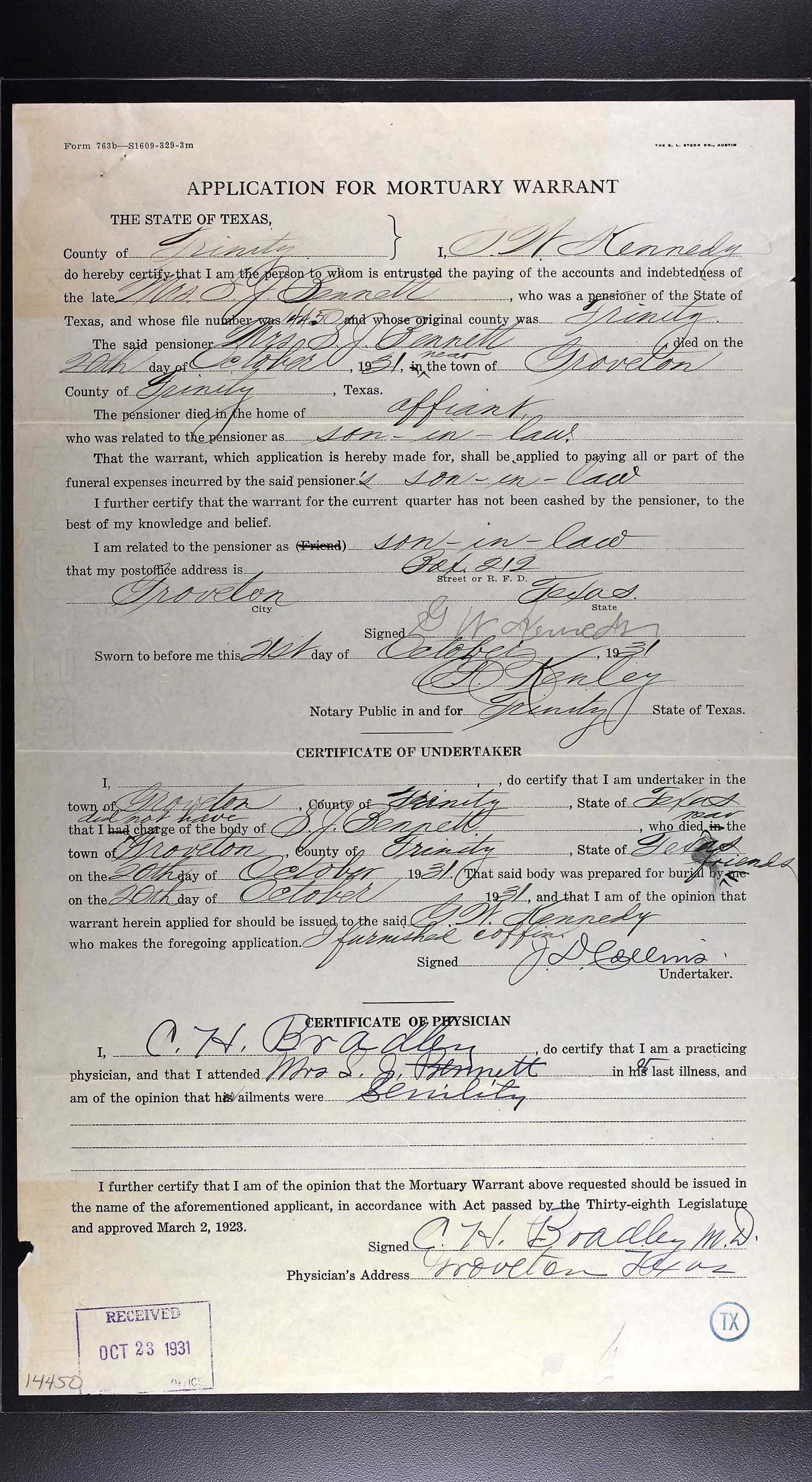 Birth: June 22, 1891 24 23 — Groveton, Trinity Co., TX, USA Death: August 15, 1973 — San Benito, Cameron Co., TX, USA |