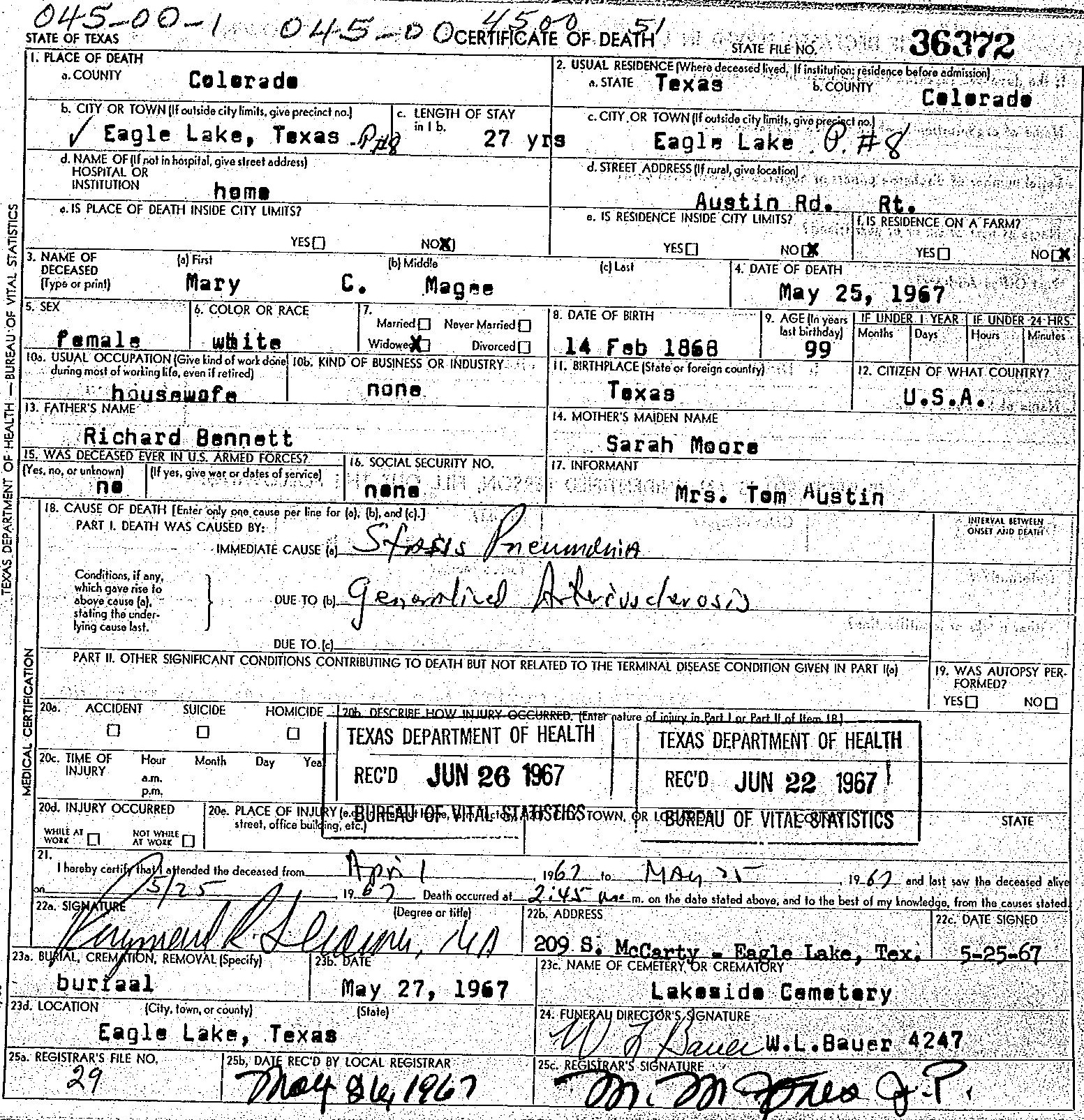 Donald MAGEE Birth: August 1898 31 30 — Trinity Co Tx Death: October 28, 1989 — Vidor Tx |
