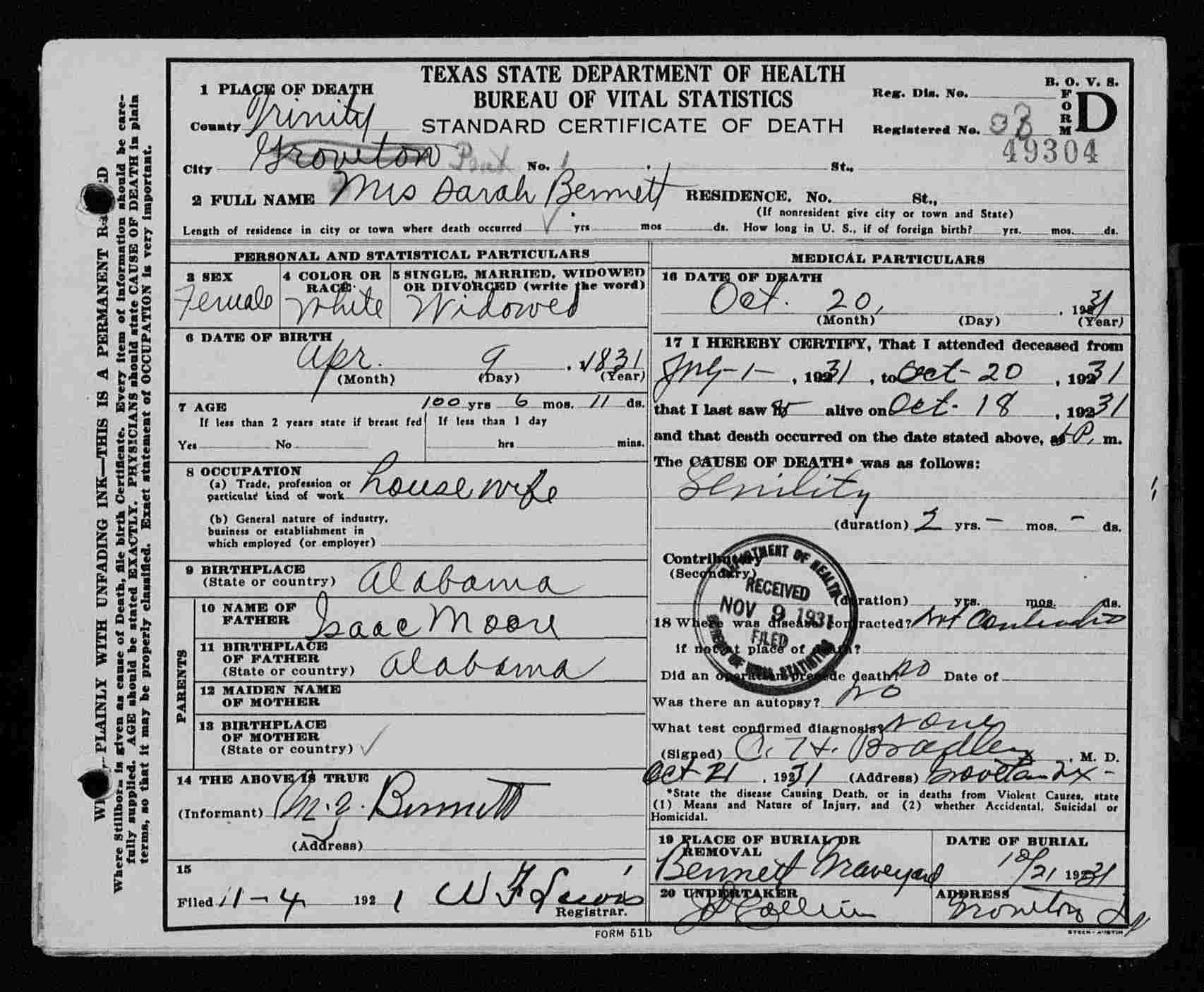 Death of a maternal grandmother | Sarah Jane MOORE October 23, 1931 (Age 28 years) Note: Paper in Confederate Widow Pension states Sarah died of senility in the home of her son-in-law GW Kennedy.