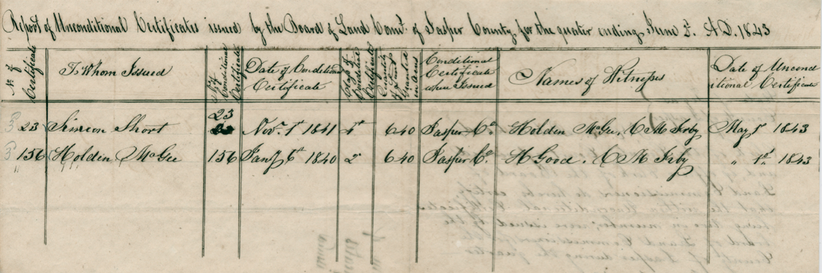 | Residence | Evidently, in Nov of 1840 Simeon and (his son?) Jonas Short moved across the Sabine to the Republic of Texas. Simeon was able to qualify for 640 acres and Jonas received 320 acres of \"Conditional Certificates\" indicating Simeon brought his family with him. |