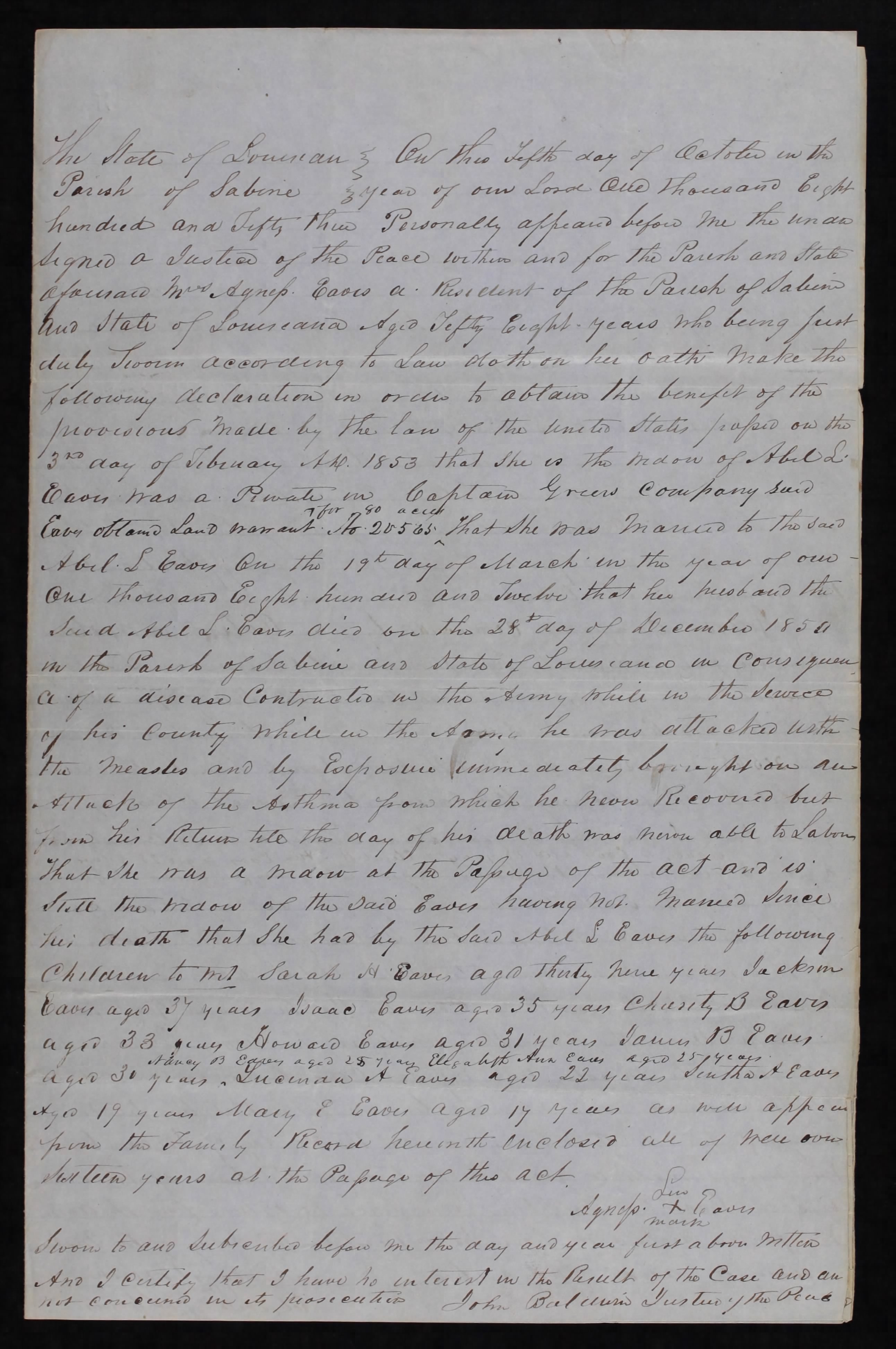 Burrell Ebenezer EAVES Birth: 1796 31 37 Death: after 1850 — possibly San Augustine TX |