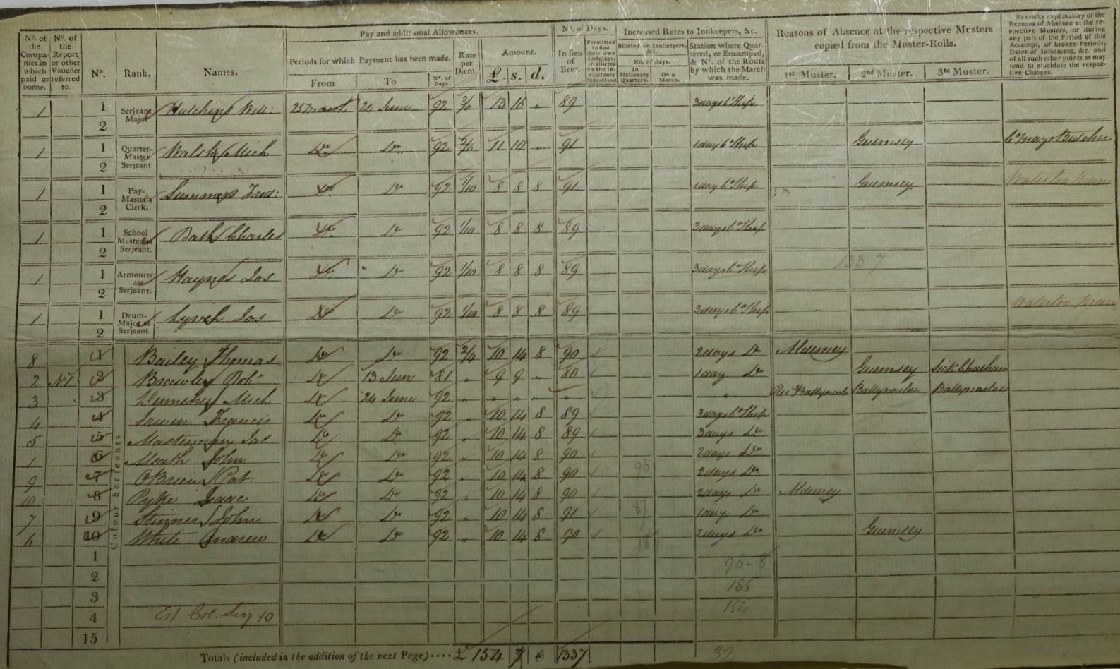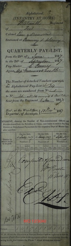 | Military | A record in Scotlands People states that John Stenna (John Stinner) of the 13th Foot in Edinburgh Castle married Ann Porter, relict of Sgt Summers of the same unit, in 1820. Evidently Frederick Summers, formerly of the 35th Foot, had reenlisted into the British Army in a different unit sometime between 1816 and 1820. This record is almost certainly a record for Ann PORTER Summers of Frensham, wife of Sgt Frederick Summers of Dursley. Records of the 13th Regiment of Foot from Jun 1817 to 1820 show that Frederick Summers had rejoined the British Army after leaving the 35th Foot in 1816. In 1817 the 13th Regiment was in the Channel Island but they were moved to Hilsea Barracks in Portsmouth in June 1819. From there they were transferred to Scotland on Sept 25, 1819 to help suppress the Scottish rebellion. At various times he was in Glasgow, Stirling Castle and Edinburgh Castle where he died before Oct 20, 1820. Napoleonic War Records 1775 - 1817 From findmypast has this entry: First name(s) Frederick Last name Summers Rank Corporal Regiment 1/13th Foot+ Enlistment year 1817 Enlistment day 10 Enlistment month Mar WO25 reference 931 Category Military Service & Conflict Subcategory Regimental & Service Records Collections from Great Britain, UK None There are 11 mentions of Frederick Summers, a payroll clerk & Waterloo Man, in WO 12/3040 and WO 12/3041 of the British Archives. (1817-1820) The first record shows he must have joined the 13th as a Corporal but was promoted back to Sergeant sometime between June and Sept, 1817. He was stationed in Guernsey for most of his time with the 13th. |