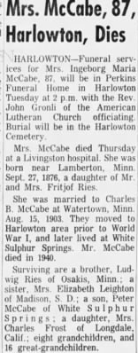 Death of a sister | Esther Marie McCABE December 27, 1976 (Age 71 years) |