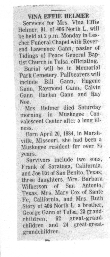 Death of a sister | Effie Melvina (Vinie) Gann April 20, 1974 (Age 78 years) |