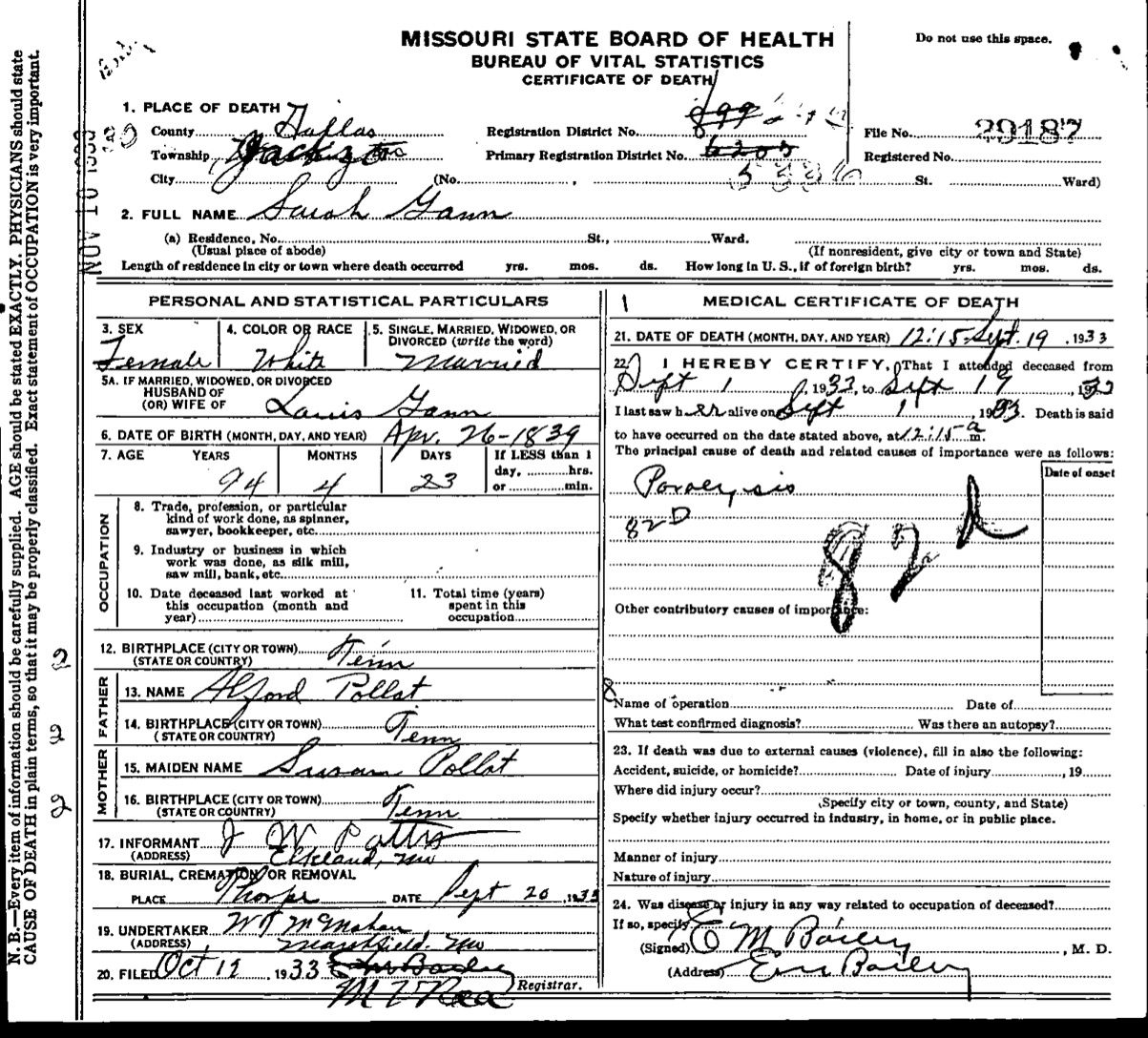 Death of a paternal grandfather | John (Jack) GANN November 5, 1871 (Age 24 years) Note: From unsourced information on the internet. "John Gann died intestate and the Dallas County, MO records of the disposition of his estate reads: 'John Gann, died 5 Nov 1871, leaving as his heirs, Ira Gann of Hamilton Co Tenn; Elisha Gann of Hamilton Co, Marsha J Hancock of Lake City FLorida, Cornelius, Calvin, Samuel, Charles and Silas Gann, all of Dallas Co Mo, Adam Gann of Wright Co MO, and the heirs of James Gann of Hamilton Co Tenn.' "