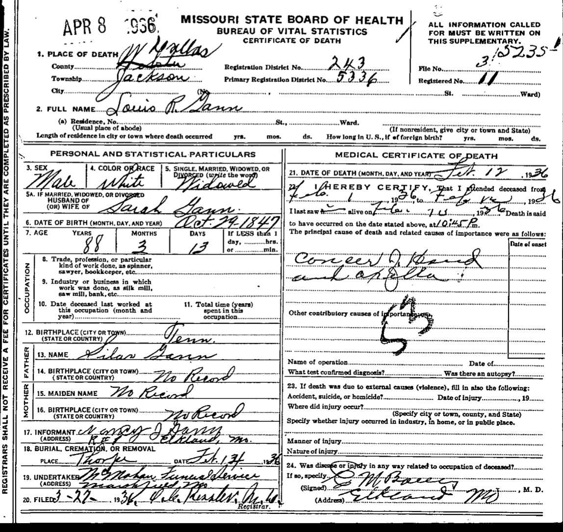Louis R. GANN Birth: October 29, 1847 31 22 — Tennessee Death: February 12, 1936 — Jackson Township, Dallas Co, MO |