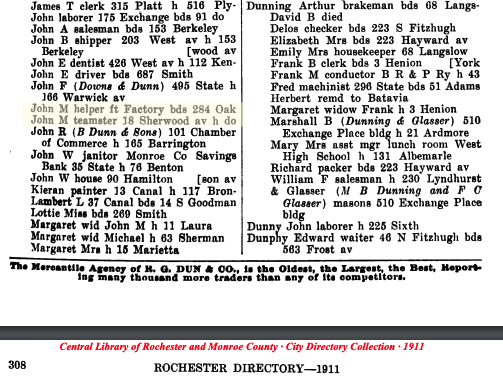 Residence | 1911 (Age 47 years) !911 Rochester Directory for John M Dunn Note: Directory shows there were 2 John M Dunns in Rochester. John Dunn was still living with his sister in law at 284 Oak.