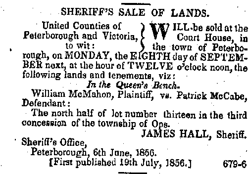 | Note | The newspaper Peterborough Review on June 13, 1856 had the following advertisement: SHERIFF'S SALE OF LAND: Will be sold at the Courthose, in the town of Peterborough, on Monday the Eighth day of September next, at the hour of 12 o'clock noon, the following Lands and Tenements, viz:- IN THE QUEENS BENCH, William McMahon, Plaintiff, vs Patrick McCabe, Defendent. The north half of Lot 13 in the 3rd Con. of the Township of Ops. James Hall, Sheriff. |