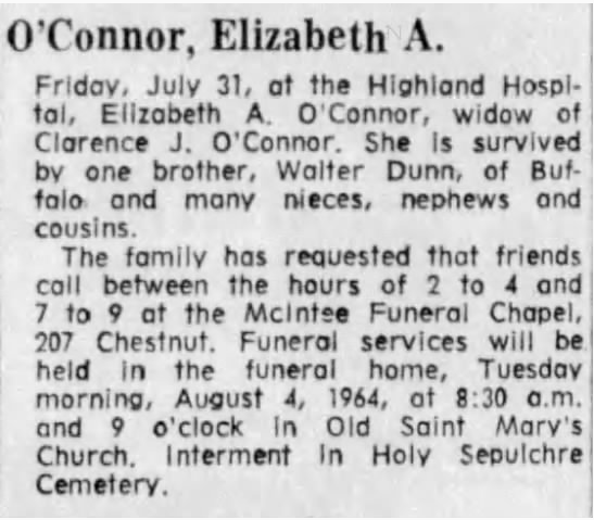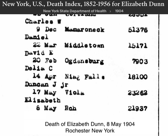 Elizabeth “Lizzy” DUNN Birth: January 1884 26 — Canada Death: July 31, 1964 — Monroe Co, New York |