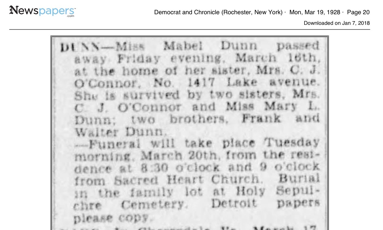 Mabel DUNN Birth: September 1896 38 — NY Death: March 16, 1928 — Rochester, Monroe, New York |