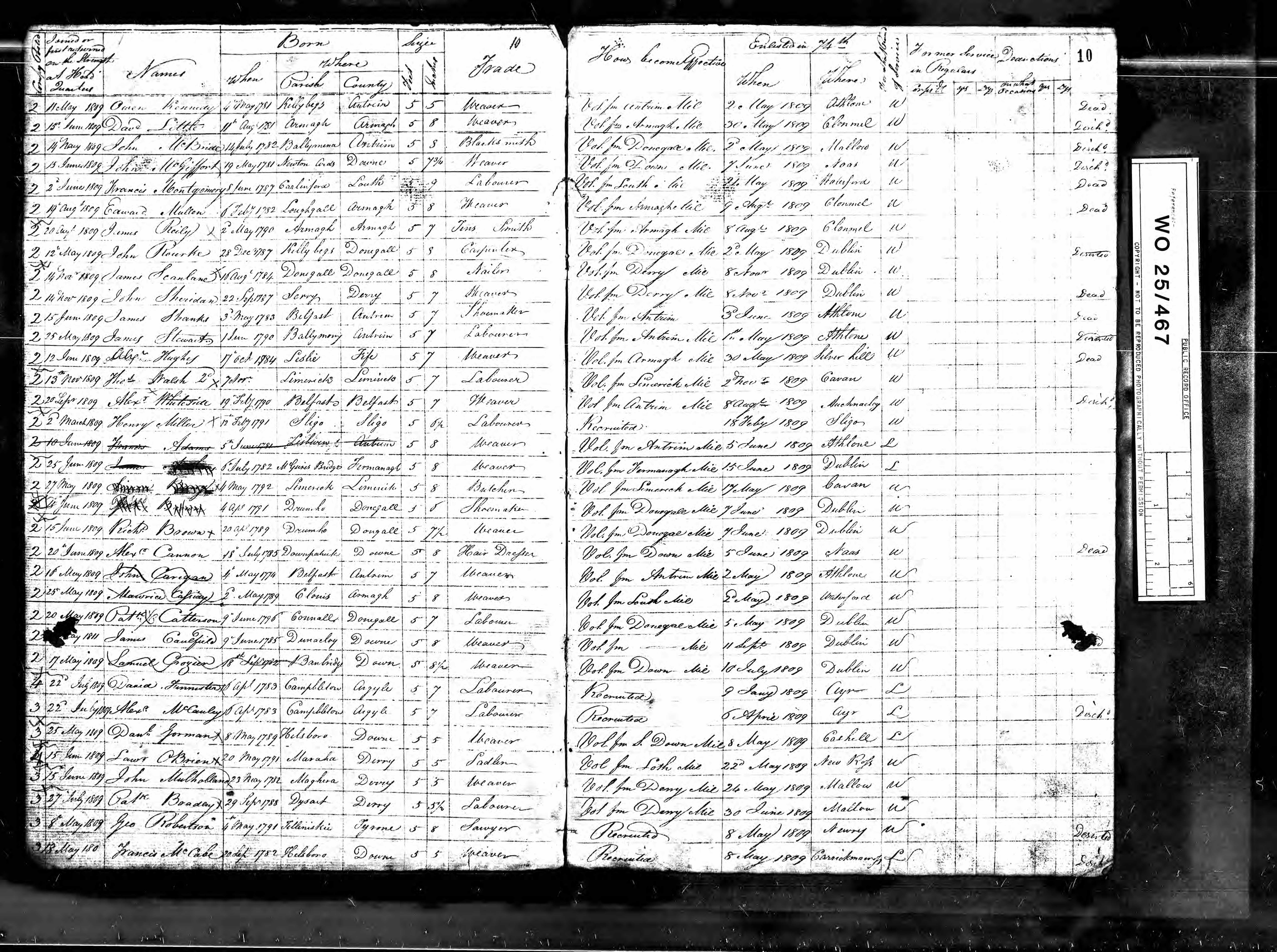 Birth | September 20, 1782 Note: Francis' service record indicates he was born on the Townland Aghnalart in the parish of Magheracloone. He returned there after his service ended. Aghnalart means "Eagles Ford" in Irish.