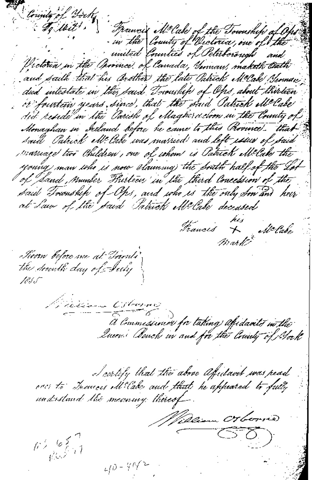 Letters For Patrick McCabe Jr. | 1855 (Age 72 years) Note: In 1848 and 1855 Francis testified in favor of his brother Patrick's ownership of lot 13 on concession 3 in OPs. Both letters verify that Patrick was his brother, that he died before 1848, that Francis was a pensioned soldier from the 7th RVB, that Patrick arrived in OPs in 1827, and Patrick left a wife, son and daughter in Ireland.