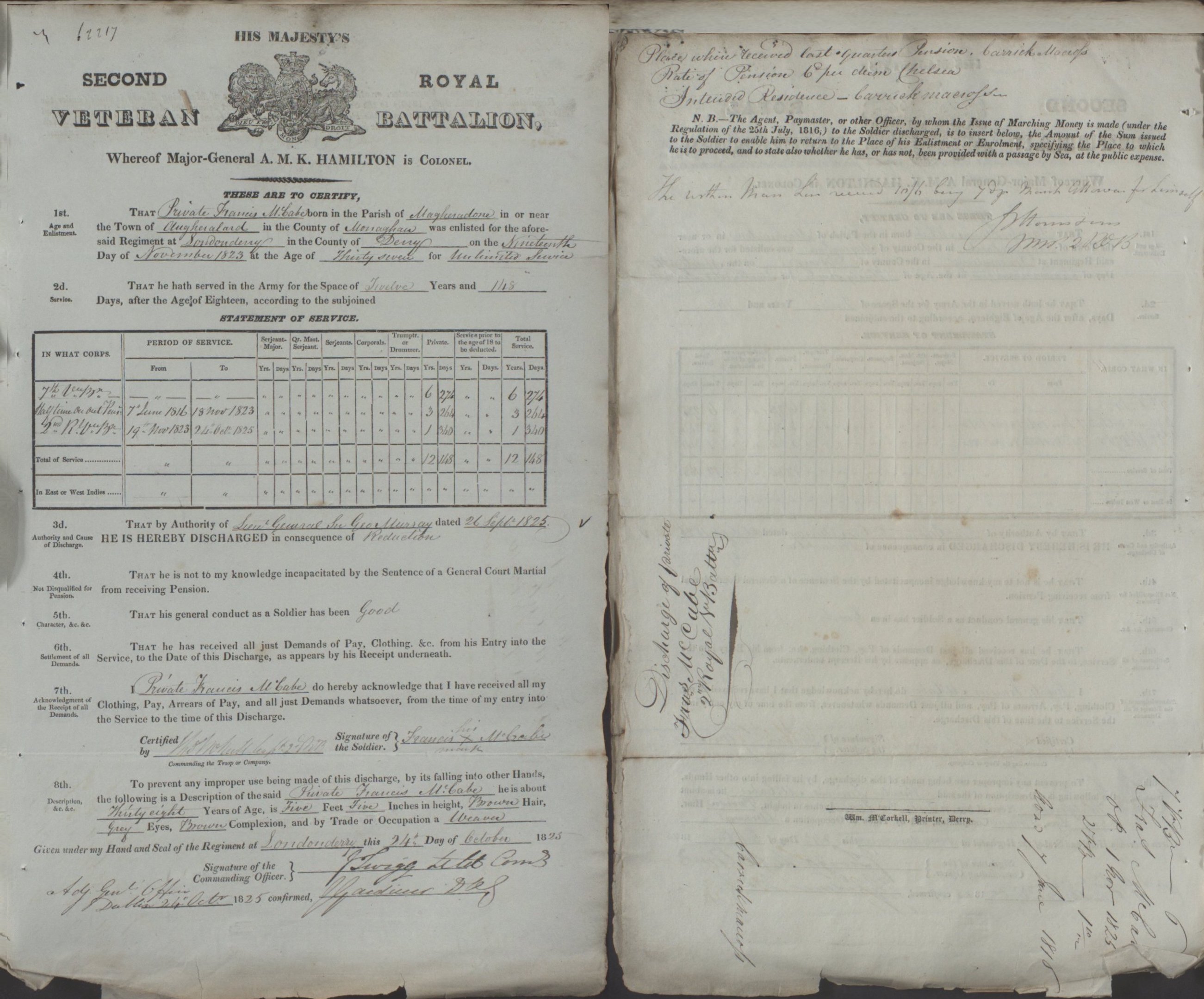 | Military | Records found in British Archives. WO 121 Royal Hospital, Chelsea: Discharge Documents of Pensioners WO 121/209 Certificates of Service and related correspondence. FRANCIS MCCABE. Born MAGHERADONE, Monaghan. Served in 7th Royal Veteran Battalion; 2nd Royal Veteran Battalion. Discharged aged 38 after 8 years 8 months of service. Partial History of 2nd RVB 1821.12.25 re-formed at Newry 1826.04.24 disbanded at Enniskillen Deployment and Service: 1821.12.25 raised at Newry 1822.04 Ireland: Londonderry 1826.04.24 disbanded at Enniskillen Francis' Discharge paper shows Francis was from Aghnalart, Magheracloone Parish,Monaghan. (Modern spelling is Aghinillard.) He was to receive his pension at Carrickmacross. |