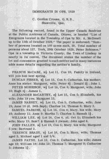 | Emigration | Original records from the Canada Archives show that Francis arrived in Upper Canada in May 1827. In December, based on his 8 years of service in the British Army, he applied to His Majesty's Representative for 100 acres of land. There is no doubt that this record is for the man Francis McCabe who received a patent in 1840 for 100 acres of land in Conc 10 Lot 11, Ops Township, Victoria County. The date, Dec 5 1827, listed on the patent agrees with the date of application on the following record. Name: McCabe, Francis Place: Toronto Year: 1827 Volume: 350A Bundle: M 15 Petition: 102 Microfilm: C-2208 Reference: RG 1 L3 Transcription (Page 1) To his Excellency Sir Peregrine Maitland CCS Lieutenant Governor of the Province of Upper Canada Major General Commanding His Majesty's Forces therein --- In Council The Petition of Francis McCabe of Toronto yeoman Humbly Sheweth That ?one petitioner is a native of the County of Monaghan, Ireland, whence he emigrated to the Province in May last with 3 Sons and 2 Daughters. That ?one Petitioner served His Majesty as a soldier upward of Eight years, and is an Out Pensioner of Chelsea Hospital, as appea? by the hospital hereto amended?. That ?one petitioner was discharged in the year 1816. that he has taken the Oath of Allegiance ??? whereof is also he?to a??ded, and having never received any ??t of Land, humbly prays Your Excellency will be pleased to present him 100 acres as a discharged Soldier. And as in ?? bound ?one Petitioner will ever pray Francis X McCabe MarkGovernment House 20th Nov 1827 (Indecipherable)I do not find that the Petitioner has received any land. or order for land. 20 Nov 1827 Thos RideoutRecommendation for 100 acres as a discharged Soldier.Order issued Same Day |