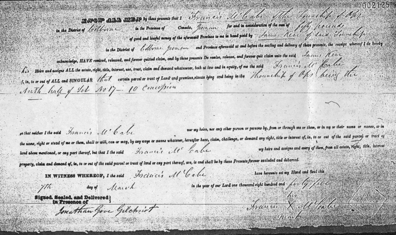 | Media object | Format: image/jpeg Image dimensions: 1,259 × 749 pixels File size: 452 KB Type: Document Highlighted image: no Note: Francis owned several pieces of property in Ops between 1828 and 1862. This document shows him selling 50 acres of land to James Kerr in 1845.