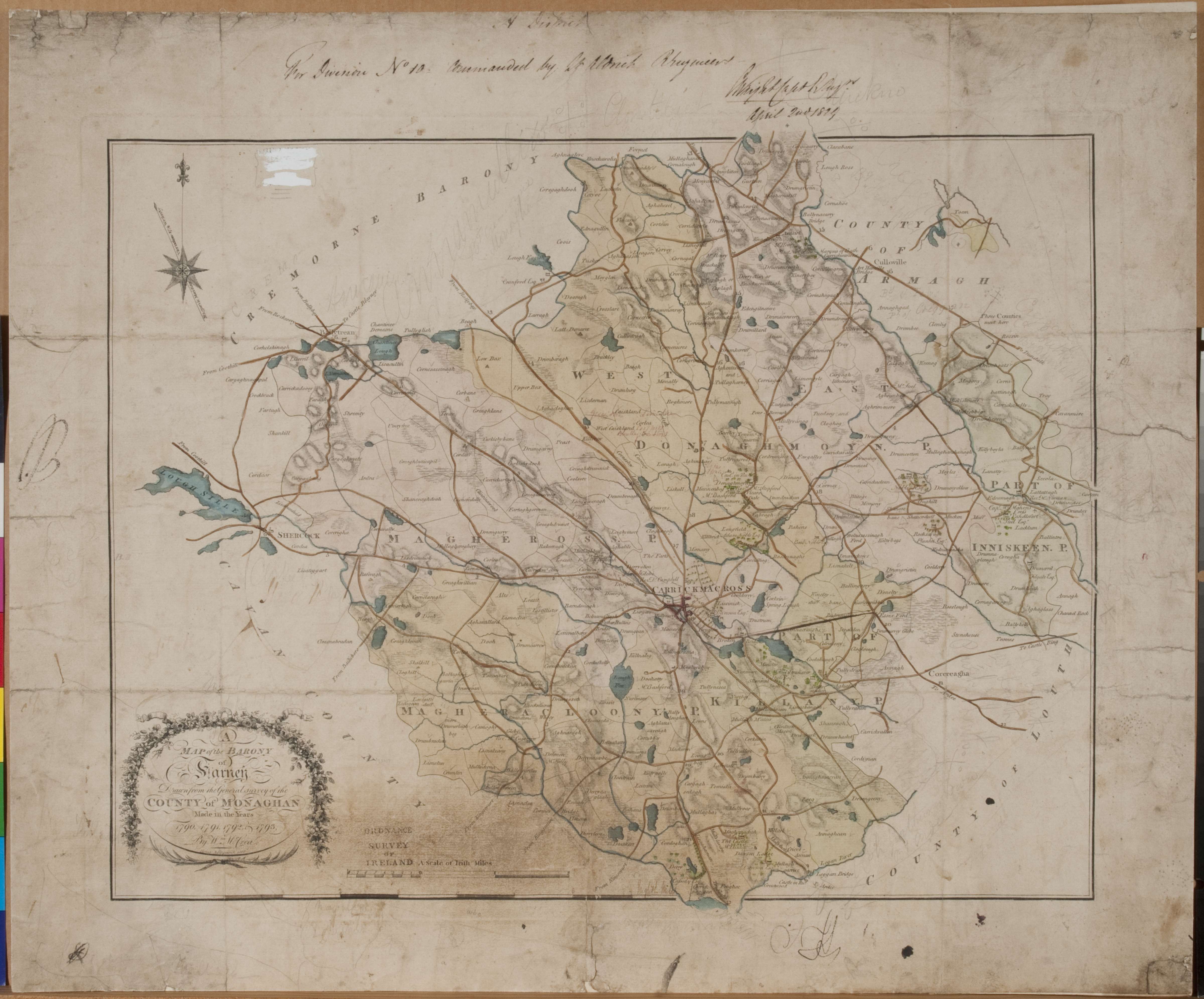 Residence | 1822 (Age 39 years) Note: In a small book (Rent Arrears 1822-1823 ) found in the in the Shirley Estate records, Warwickshire Archives (CR 229 16/1), an entry was found for Francis McCabe - proving that he returned to Aghnalard after being pensioned from the British Army in 1815. It showed that he was 6.7.8 (English money) in arrears on his rent for land on Aghnalard in Magheracloone parish. It was later in 1823 that he rejoined the British Army, though it is not clear whether he was recalled to the service or he rejoined voluntarily.