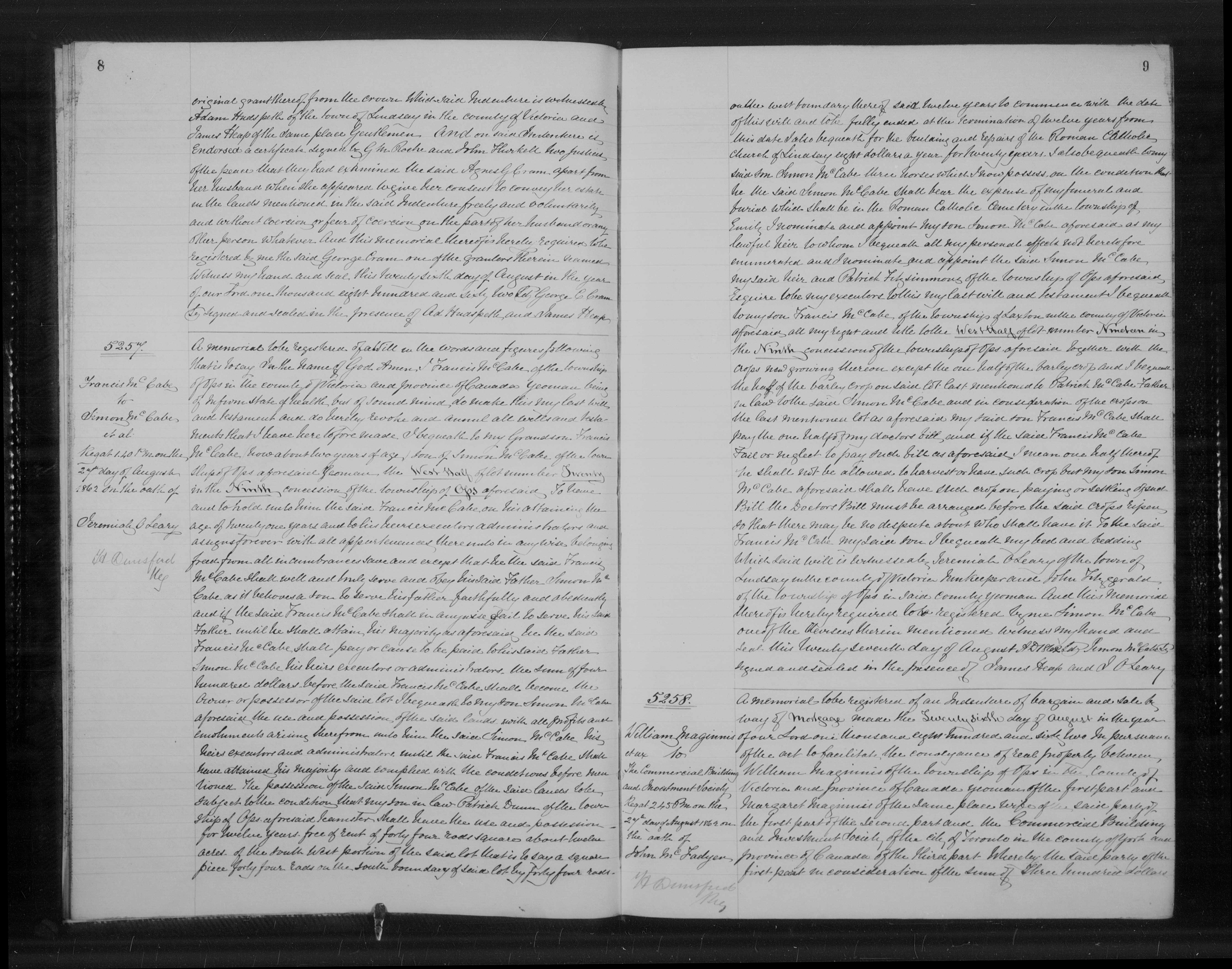 Property | Concession 9 Lot 19 1862 (Age 79 years)Note: The documents contained within this item show the continuous relationship to this lot by Old Francis McCabe heirs, eventually ending with the sale and waiver of rights to the land by Francis' known daughter Elizabeth Dunn to Thomas McCabe, son ofFrancis McCabe and Margaret Martin. The purpose of this demonstration is to argue that the son named Francis (of Laxton) who inherited rights to this property in Old Francis' will of 1862 is the same man as the father of the man (Thomas McCabe) who ended up with the property in 1895. Thus establishing the father/son relationship between Old Francis and Francis McCabe, husband of Margaret Martin and father of Thomas McCabe.